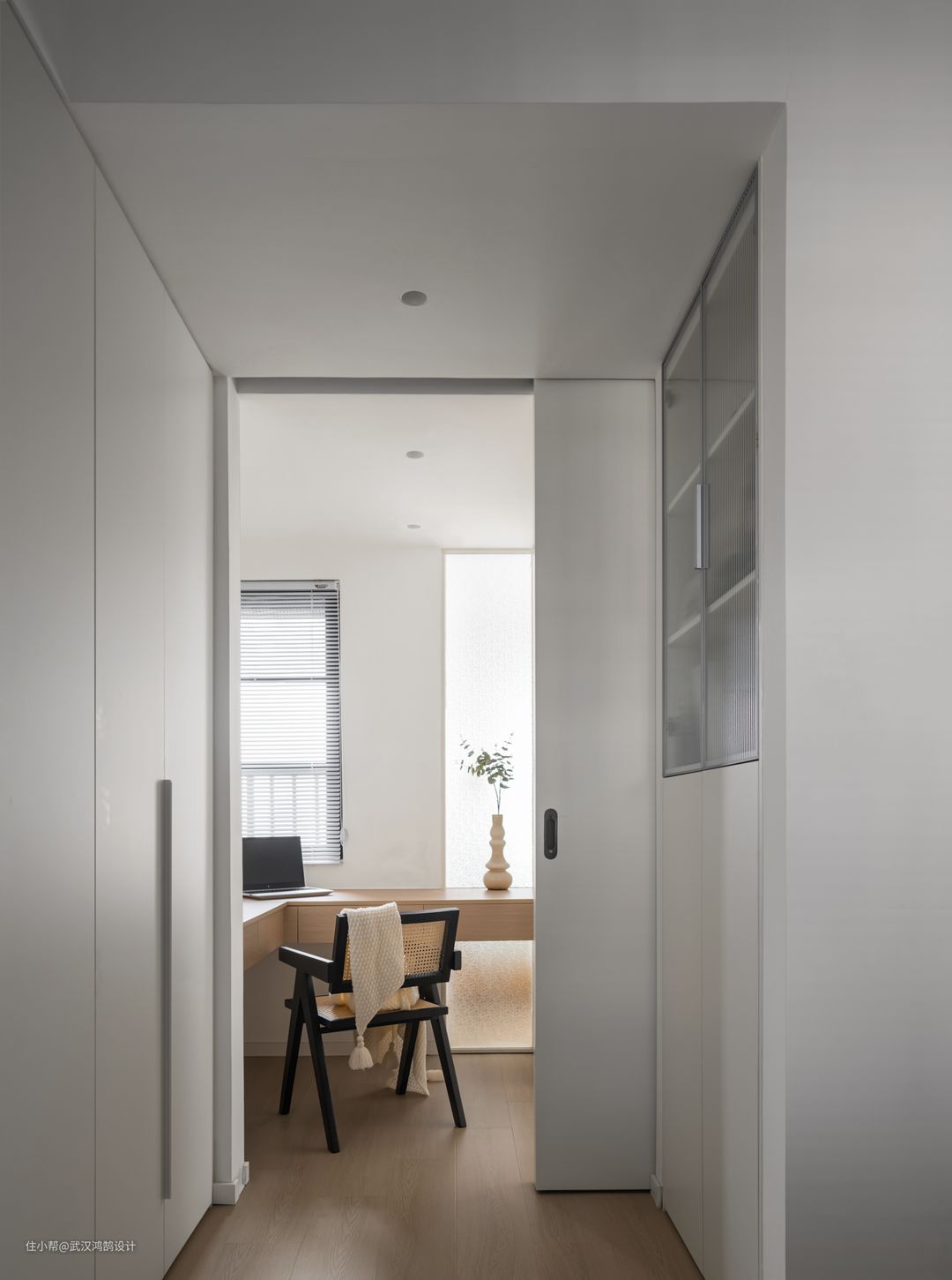 原结构的小三房,改造后:一个变成了多功能房,一个变成开放式书房,室内的边界被整个外移,悬浮书桌和休闲椅,这里变成了“一清二白”的书房 一整排顶天立地的衣柜可以存放换季衣物,还放了一个榻榻米拼接床,可以作为临时居住空间 还可以作为平时画画、跳操的休闲空间