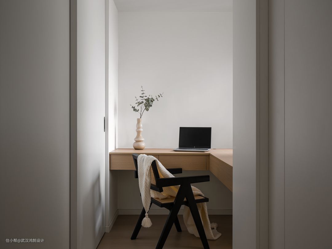 开放式书房,L型的悬浮书桌把2个房间链接起来了,L型布局,一体化设计可简单又落落大方,2个窗户采光充足,视野也开阔。