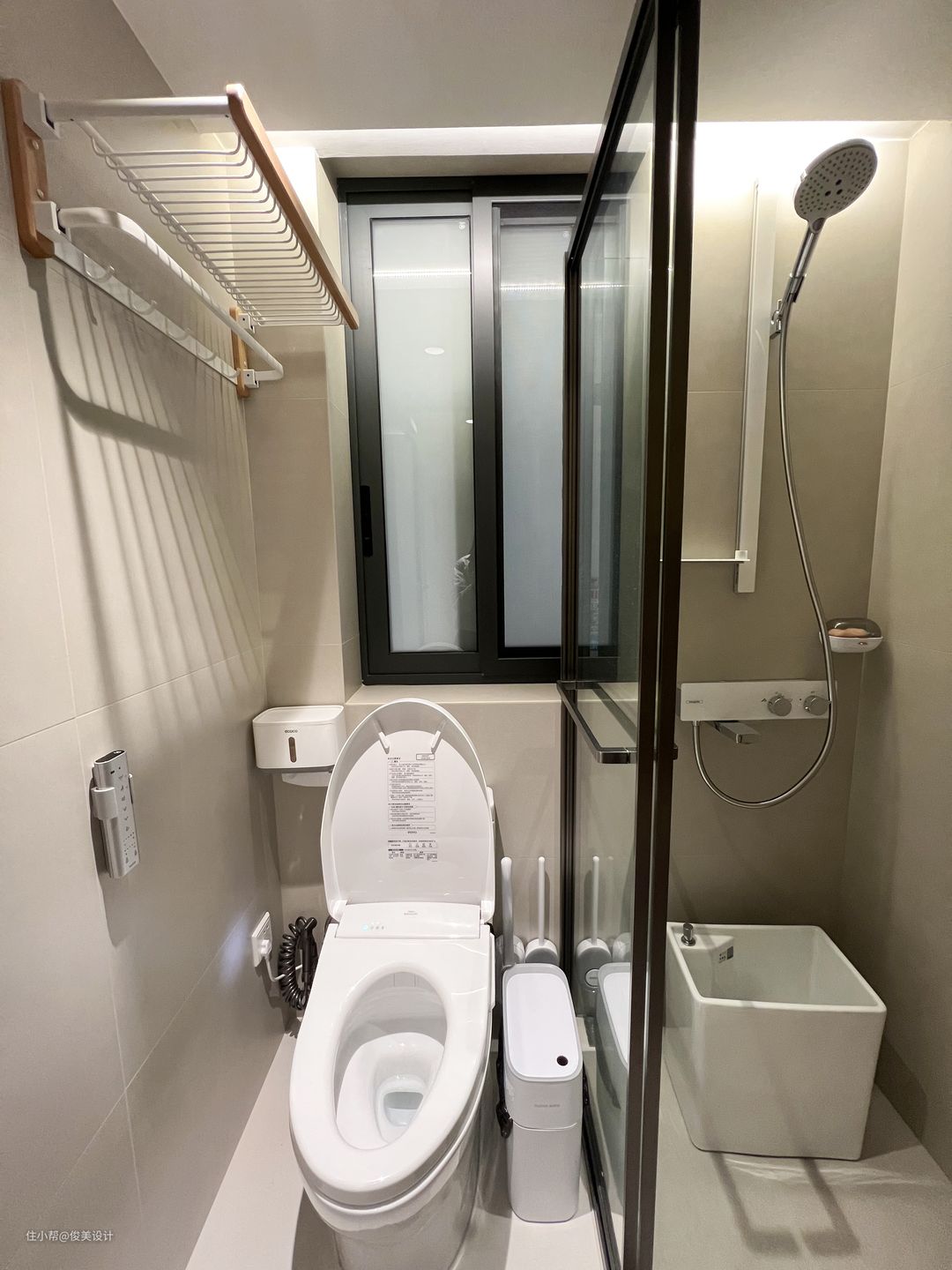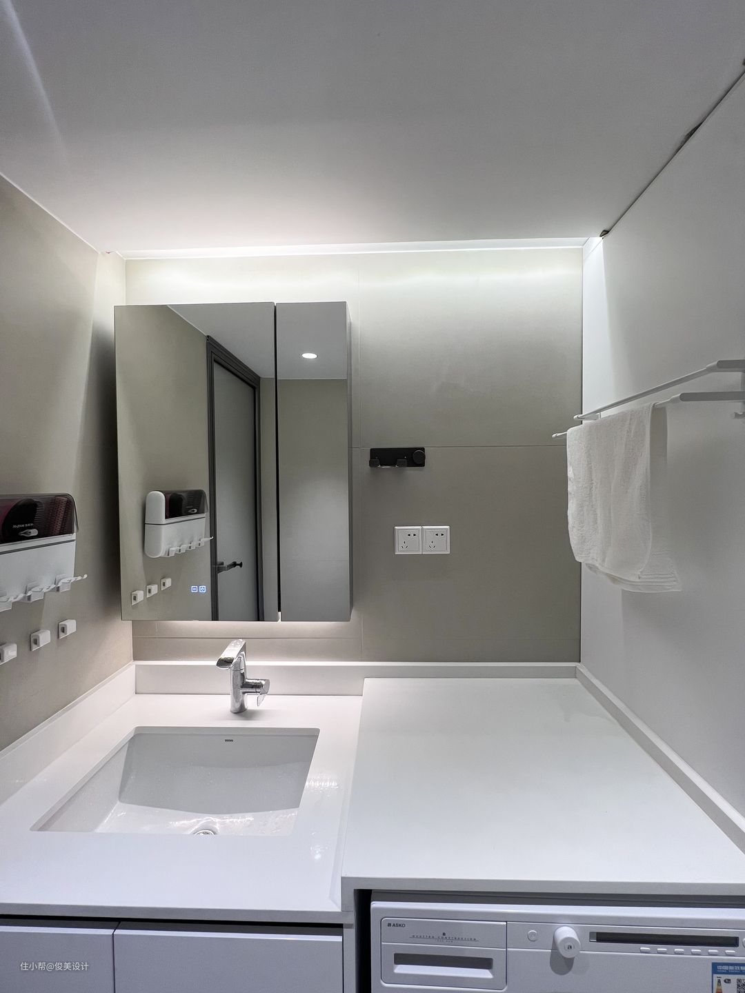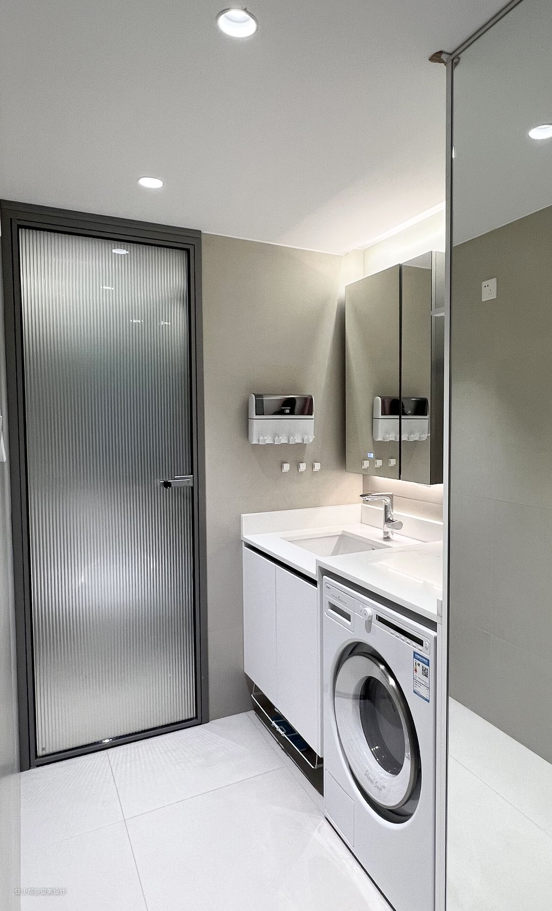 卫生间采用干湿分离设计,同时采用智能化马桶,更加高级清洁,流畅的线条让人体会到现代的设计感,智能坐便器有自洁除臭的功能,省水又卫生。卫生间也有挂在墙上的置物架,放置额外的用品,十分方便。浴室选用透明式玻璃门,浴室墙面使用防潮定制,旁边设计置物架,节省了空间,又很好的避免水汽。洗手台与马桶和浴室分隔开来,镜柜设计线条圆润又流畅,也很有品位,实用性非常好,还放置了全自动洗衣机等等,让浴室空间得到充分利用。此外,还有一个大大的镜柜,既可以洗完澡后照一下,又能存放日用品。