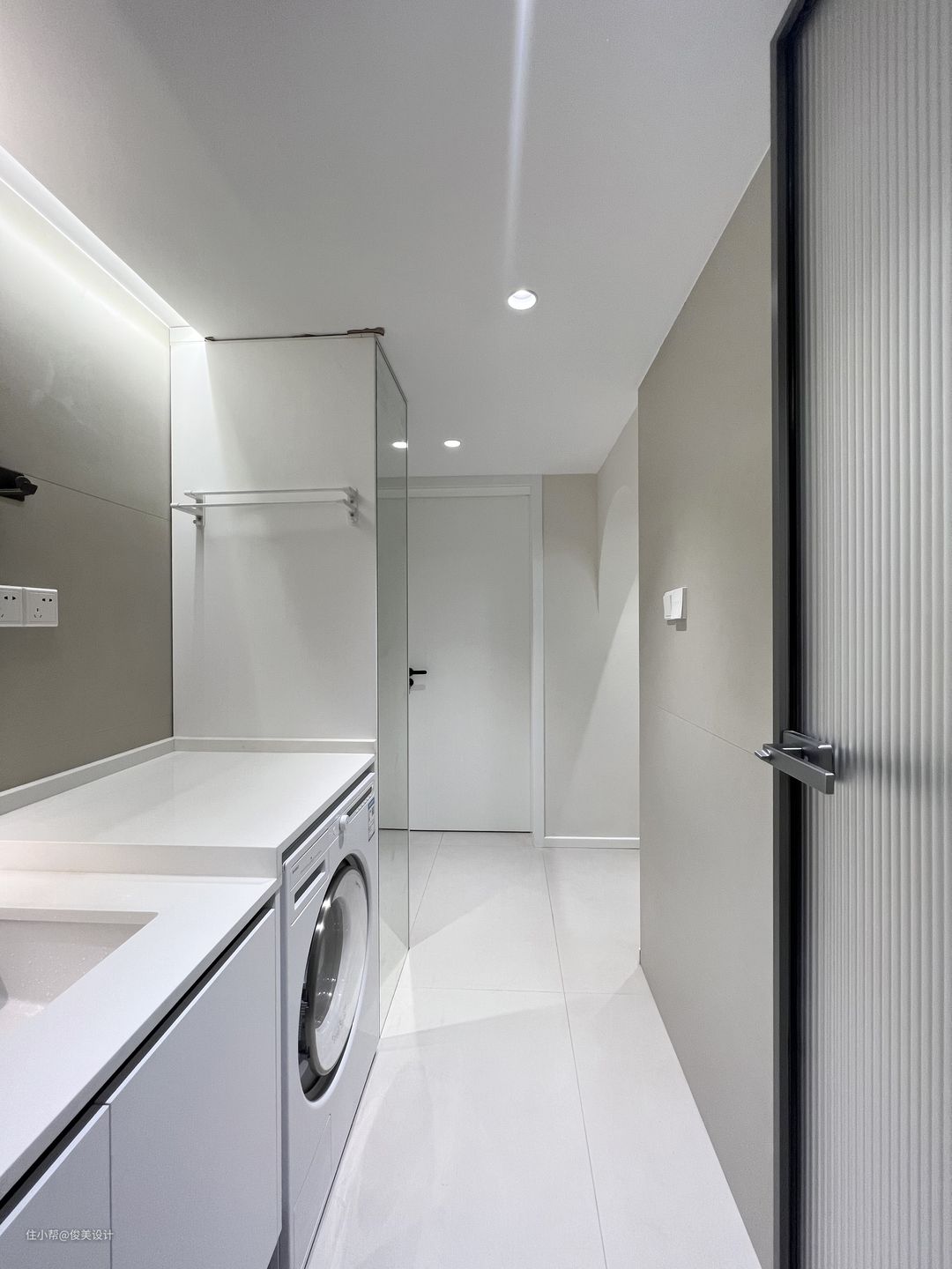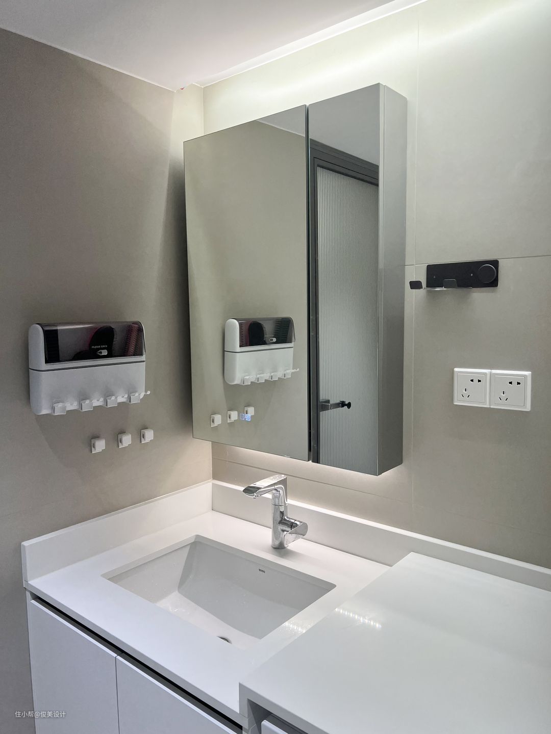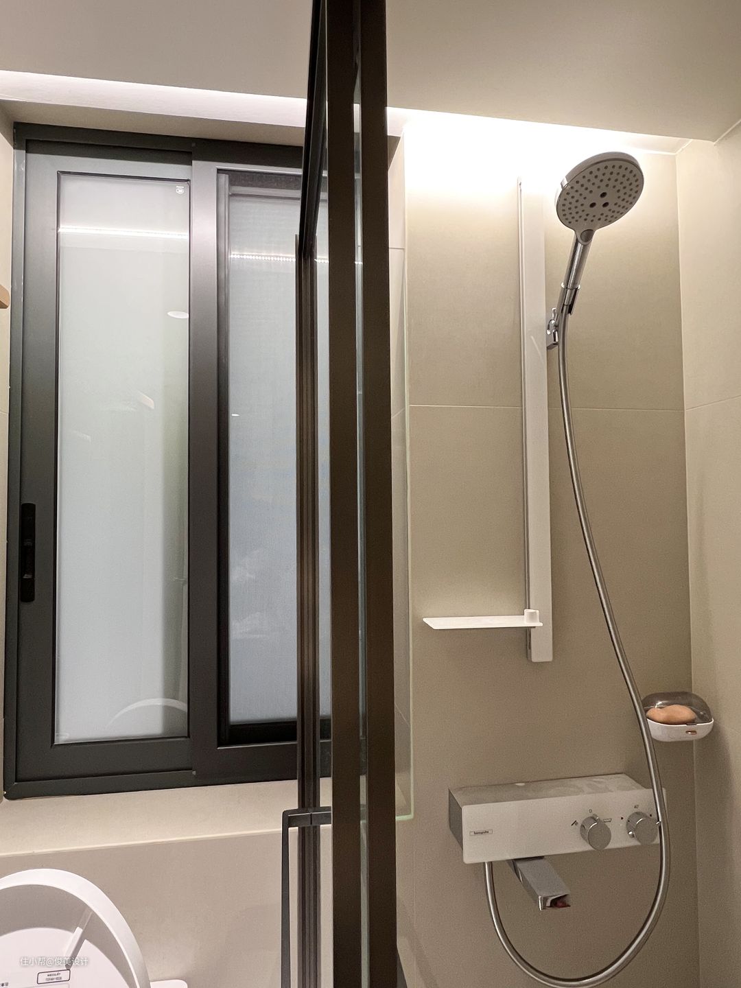 卫生间采用干湿分离设计,同时采用智能化马桶,更加高级清洁,流畅的线条让人体会到现代的设计感,智能坐便器有自洁除臭的功能,省水又卫生。卫生间也有挂在墙上的置物架,放置额外的用品,十分方便。浴室选用透明式玻璃门,浴室墙面使用防潮定制,旁边设计置物架,节省了空间,又很好的避免水汽。洗手台与马桶和浴室分隔开来,镜柜设计线条圆润又流畅,也很有品位,实用性非常好,还放置了全自动洗衣机等等,让浴室空间得到充分利用。此外,还有一个大大的镜柜,既可以洗完澡后照一下,又能存放日用品。