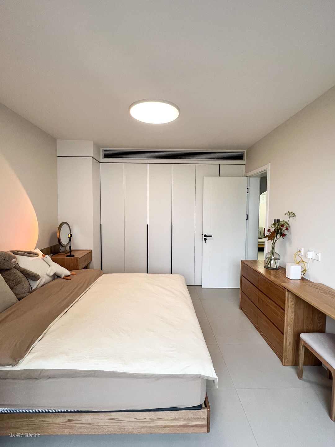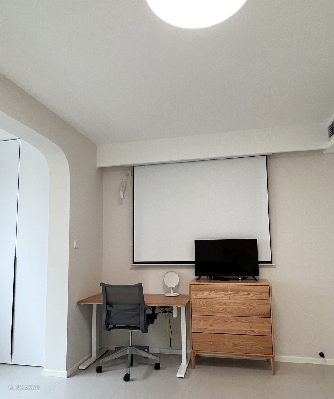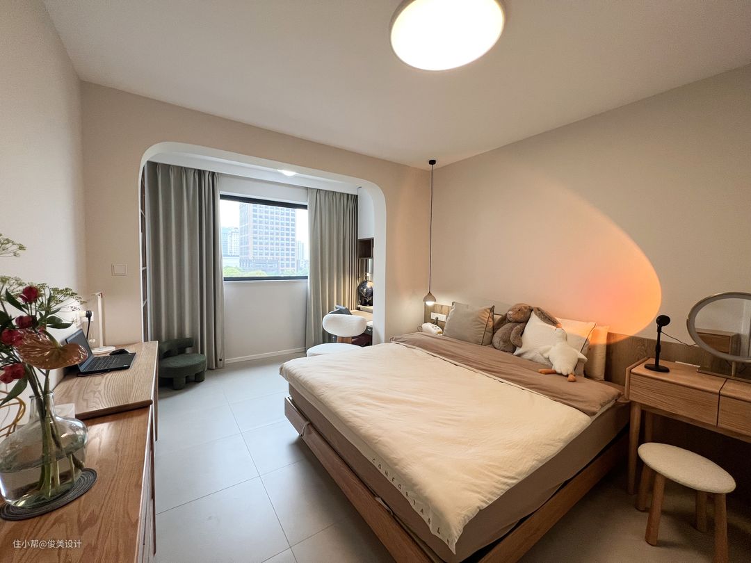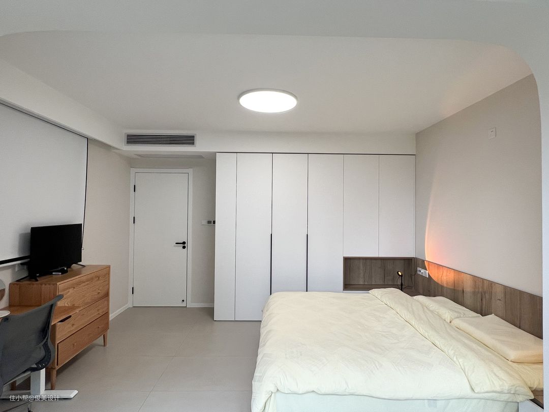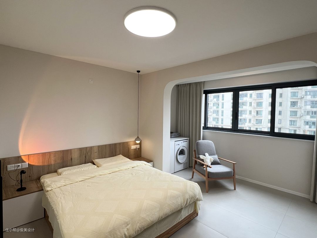 主卧与儿童房的装修风格也很相似,奶油风格的卧室崇尚小巧而精致,采用浅色简单的米白色,明亮简单的灯点缀,做成了一个舒适的睡眠区,显得温馨舒适。墙的对面是一个斗柜,日常可以用来办公与学习。主卧同样有一个大阳台,一面装了米白色的柜子,另一面放置了洗衣机,上面还有一个折叠的智能洗衣桶,储物空间很好的满足,同样可以坐着晒晒太阳,看看窗外的风景。一整面的窗户让卧室不仅阳光充足,而且通风效果也好。主卧同样是到顶的大衣柜,满足日常的穿衣储物需求。此外,主卧的对面是投影,可视角大,可以选择合适的角度观看,提高观看体验,画面色彩还原度高,整体画面亮丽逼真,画面效果也很好。