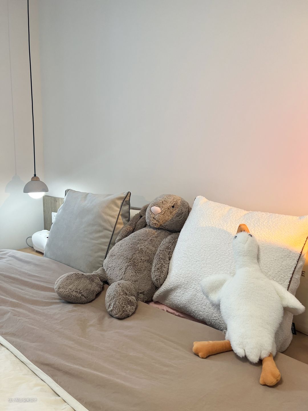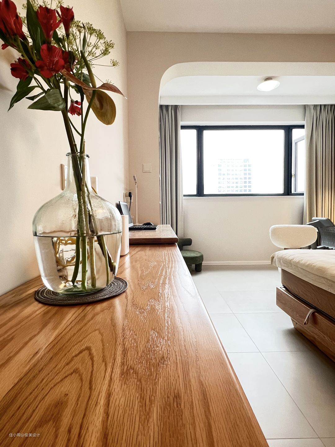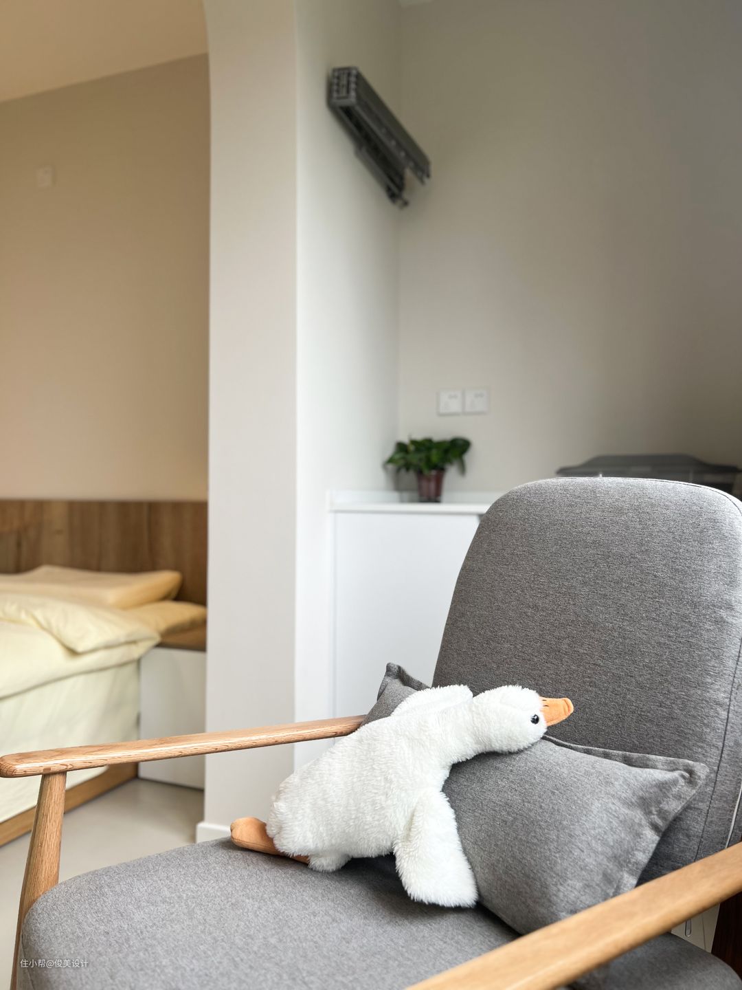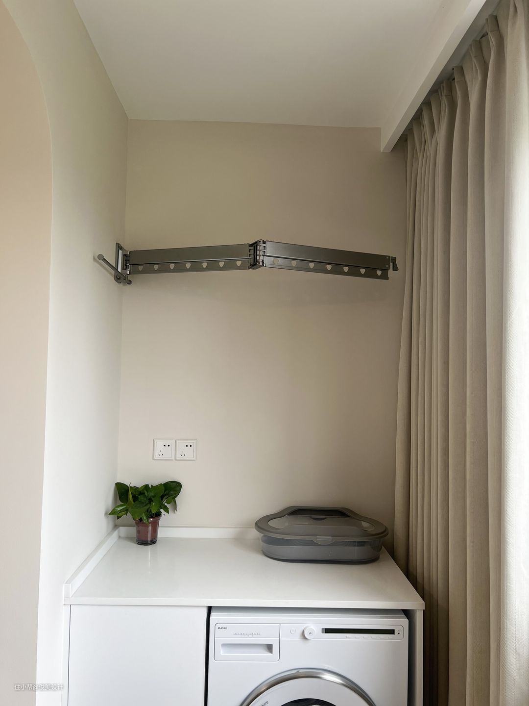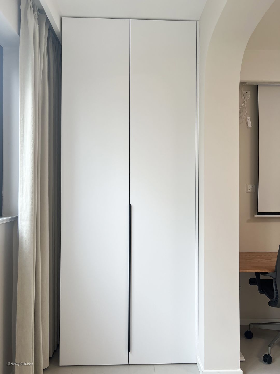 主卧与儿童房的装修风格也很相似,奶油风格的卧室崇尚小巧而精致,采用浅色简单的米白色,明亮简单的灯点缀,做成了一个舒适的睡眠区,显得温馨舒适。墙的对面是一个斗柜,日常可以用来办公与学习。主卧同样有一个大阳台,一面装了米白色的柜子,另一面放置了洗衣机,上面还有一个折叠的智能洗衣桶,储物空间很好的满足,同样可以坐着晒晒太阳,看看窗外的风景。一整面的窗户让卧室不仅阳光充足,而且通风效果也好。主卧同样是到顶的大衣柜,满足日常的穿衣储物需求。此外,主卧的对面是投影,可视角大,可以选择合适的角度观看,提高观看体验,画面色彩还原度高,整体画面亮丽逼真,画面效果也很好。