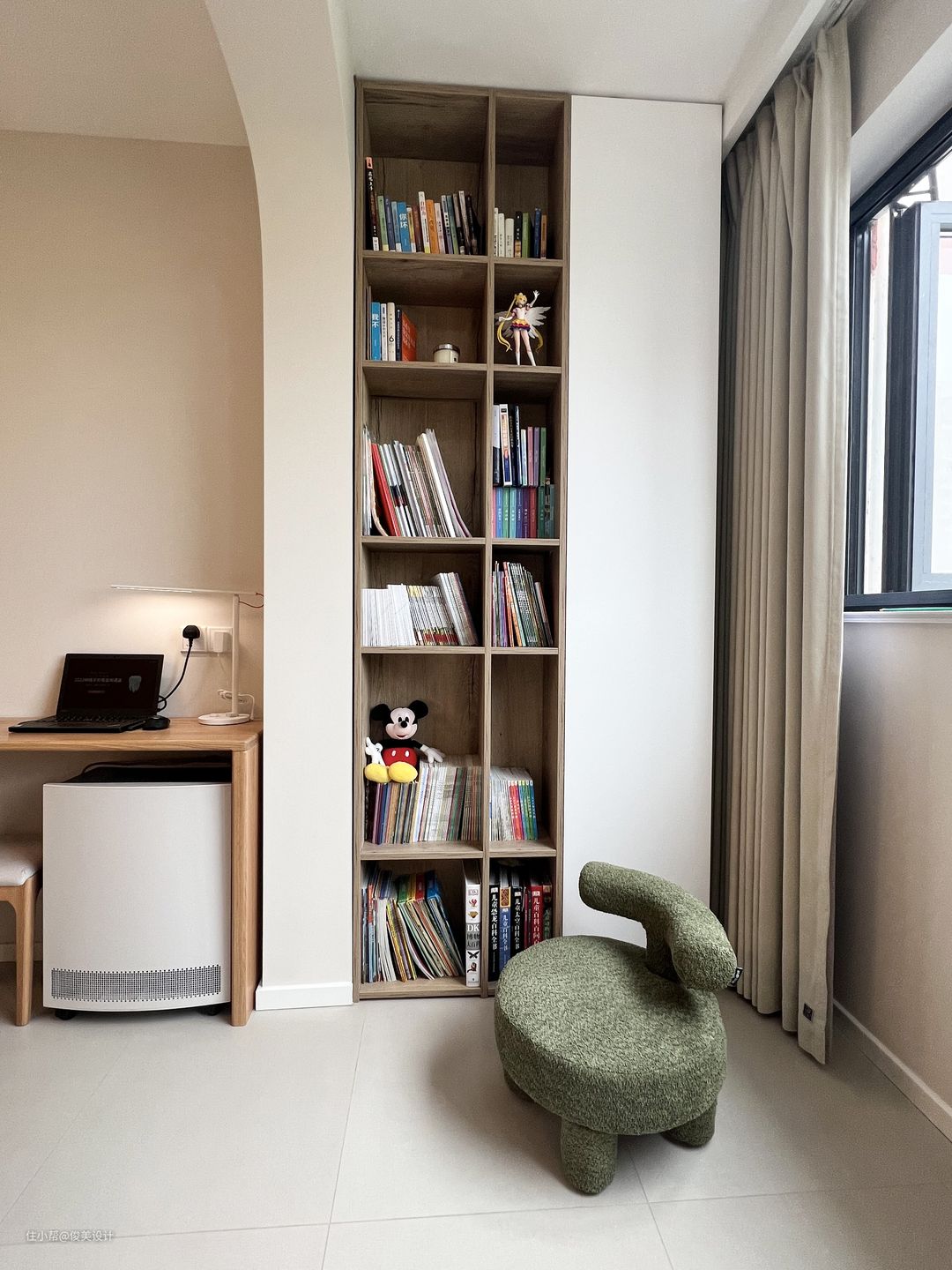儿童房是很舒适的奶油风,空间很大,整体以米色与棕色为主,棕色实木的柜子在灯光的照射下很有温馨感,也将整个卧室的品质感烘托起来。床体与柜子的颜色一致,软软的床头舒服又高级,床的对面是大大的斗柜,摆放着花瓶与绿植,让人感觉温暖而又贴心。一面墙的到顶大衣柜可以储存平时的衣物,十分方便,简约又实用。儿童房还有一个大阳台,一面装了米白色的柜子与升降桌,另一面装了到顶的储物柜,装着书籍与玩具饰品,储物空间很好的满足,在闲暇时也可以坐着晒太阳,看看窗外的风景。两个原木的小椅子给人一种低调、朴实的质感,同时地面以浅色柔光为主,顶面造型以极简为主,没有过多复杂的造型。