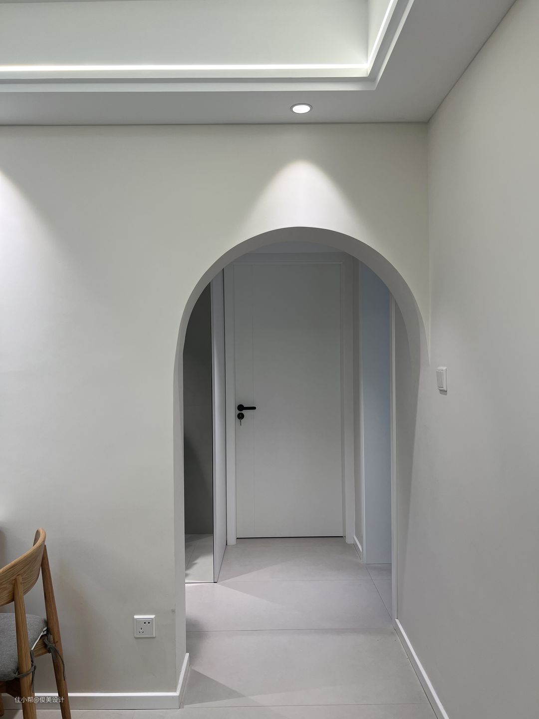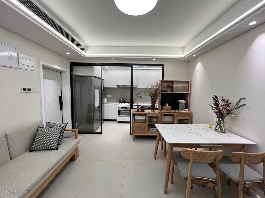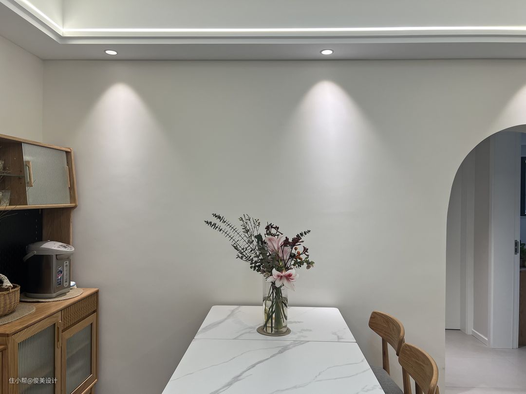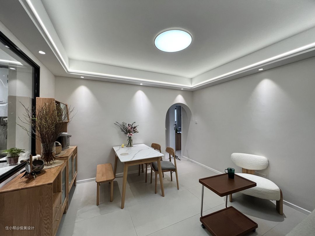 餐厅与客厅连在一起,采用开放的设计,餐桌为白色带花泽的大理石方桌,椅子是软座木质的,显得十分质感。餐桌上面摆放着绿植,圆形的桌子可以满足五六个人就餐,餐厅另一面是一个壁橱,用来放厨房的用品与日常的物件,设计的非常漂亮。客厅与餐厅的墙面都是素雅的米白色,餐桌对面是一个沙发,沙发同样采用木质,放置了柔软的坐垫,整体视觉感是偏柔美的,丰盈体型的家具给人一种奶呼呼的视觉感受。客厅的很多地方都放置了巧妙的小物件,满足了收纳的需要,还可以看出业主的审美,给空间增添了情趣。沙发两边是简约时尚的可推式小桌子,既不占地方又可以放置基本的物件。客厅的灯光为一圈射灯与一个圆圆的顶灯,显得空间明亮舒适。房子的大门为灰色木纹风格,与整体色调很配,软乎乎的奶油风。客厅与其他房间的门采用拱形的开放设计。