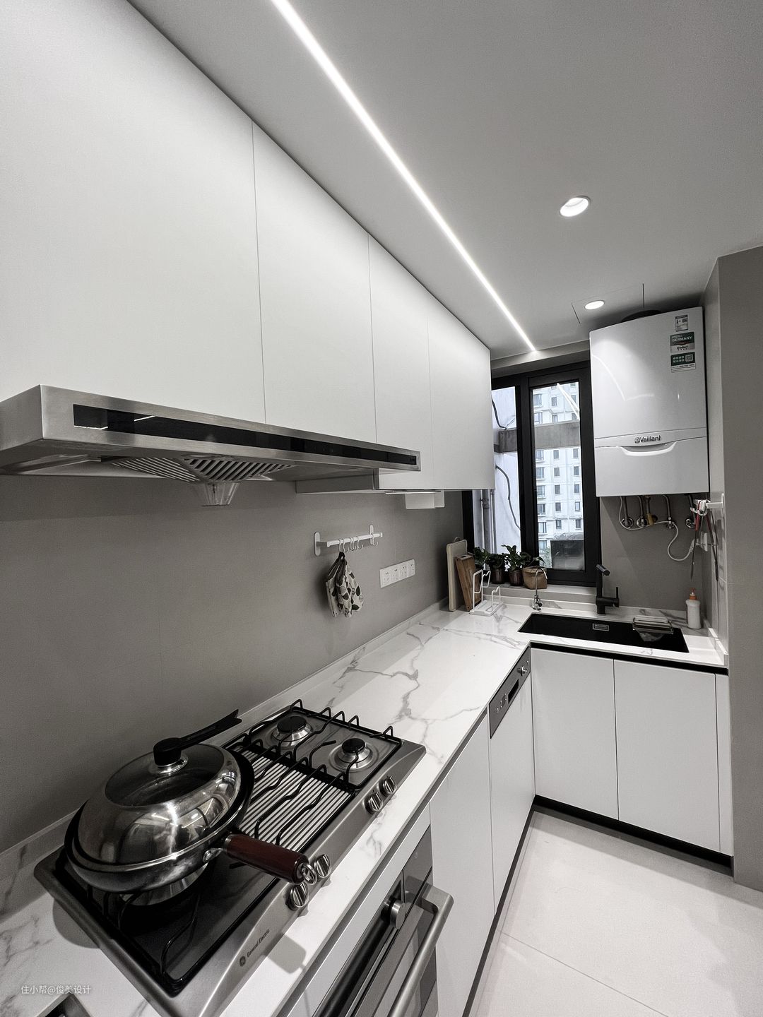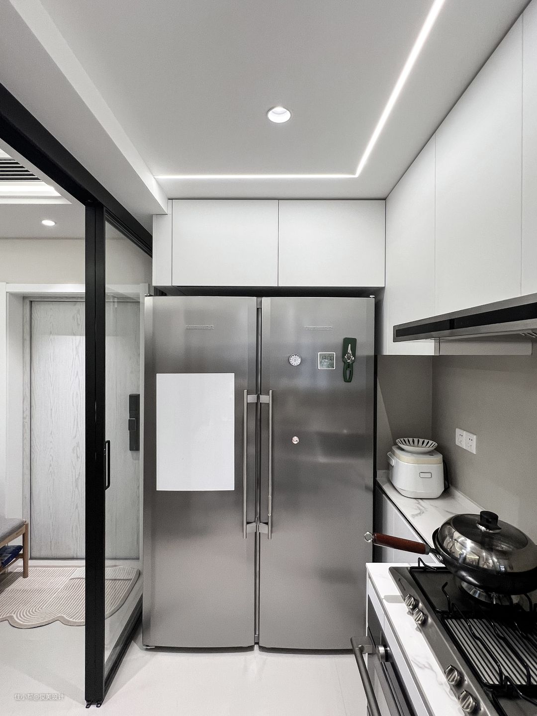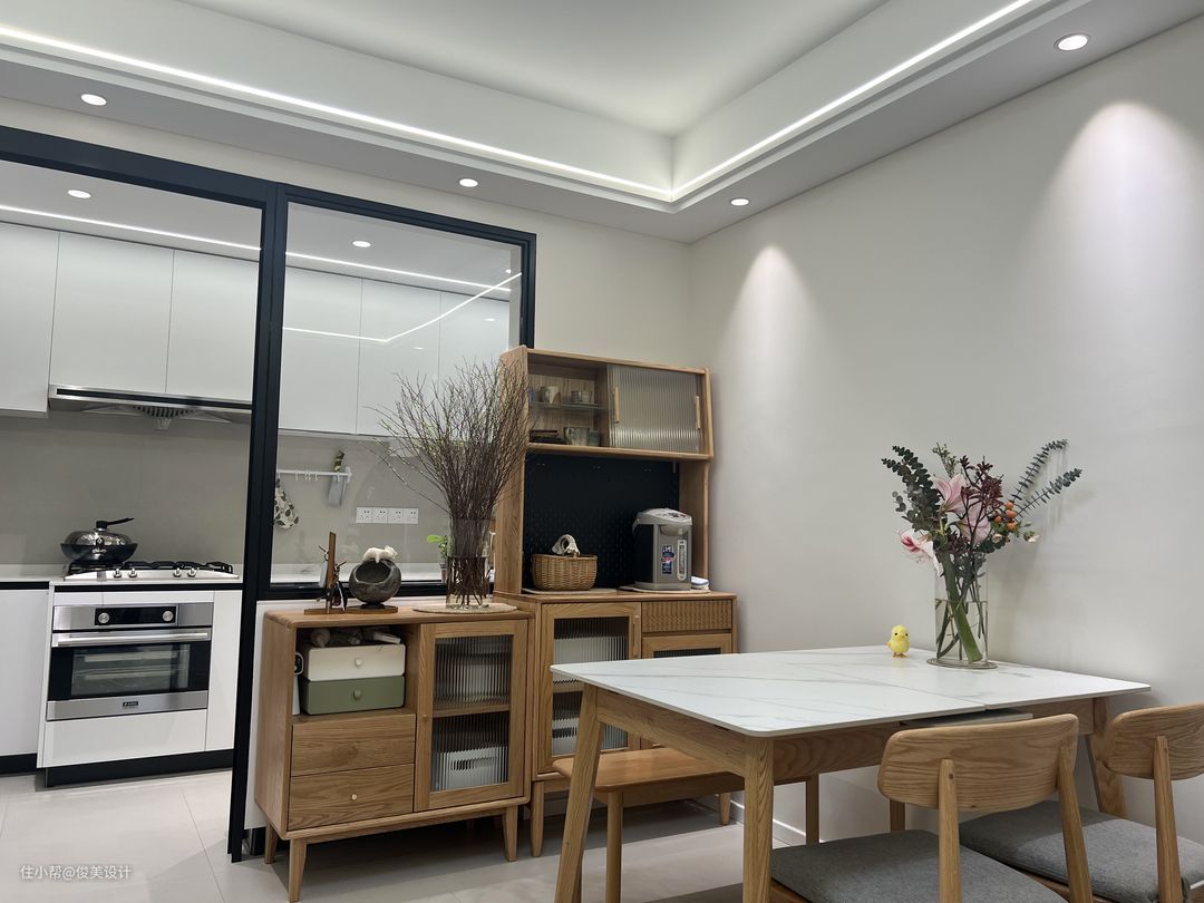 厨房以整洁简约的白色为主,采用L型的设计,桌面是带有花纹的白色的大理石,橱柜也是非常简约的白色的,整体显得干净又高级。同时嵌入煤气灶、油烟机、微波炉等必备厨房电器,与整体很好的融合在一起,充分满足做饭需求。双开门的灰色大冰箱放在厨房另的一侧,正好利用了空间,美观实用。采用大大的玻璃门与餐厅分割开,尽显简约大方。
