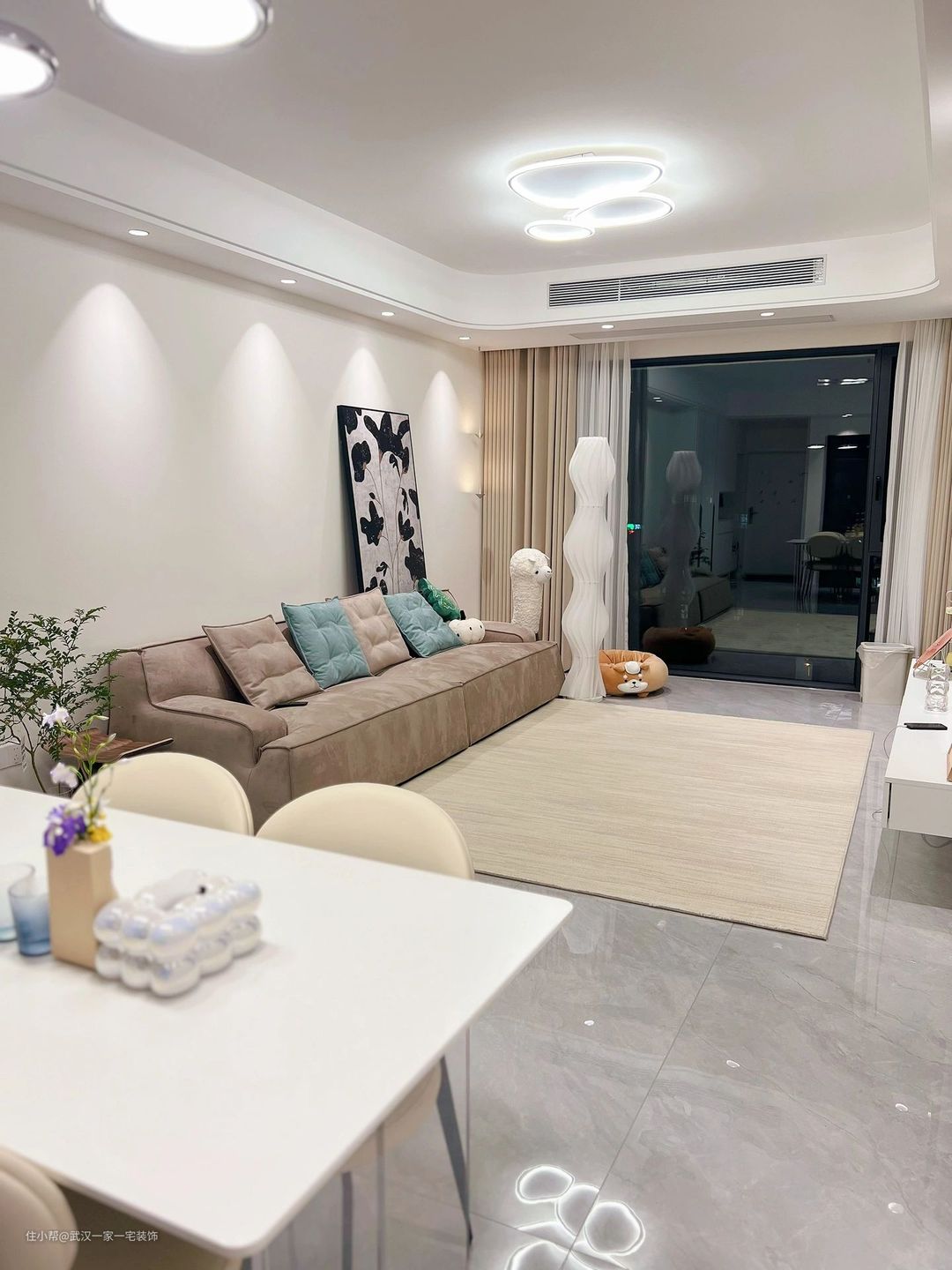 该户型为93平3居室格局。硬装全包总费用为11万,房屋为奶油风格的设计。 本套房屋户型还算方正,主卧和阳台朝南,阳台与客厅之间打通之后通风采光好。奶油风很不错,清新自然、简约质朴。不花哨、注重用舒适质感的颜色或材质去构造整个画面,因此奶油风格的家装看起来简单却可爱富有亲切感。 3居室精装房的房间都特别小,而且餐厅和厨房的采光条件有点差,这可是一个精致girl不能容忍的,于是女主提出了几点需求:厨房和餐厅增加采光;充足有序的收纳空间。设计师都有一一实现:1、拆除非承重墙、阳台与客厅打通,餐厅采用通透玻璃门;2、储物功能分区管理,客厅、走廊、卧室各司其职,不放过每一寸空间。