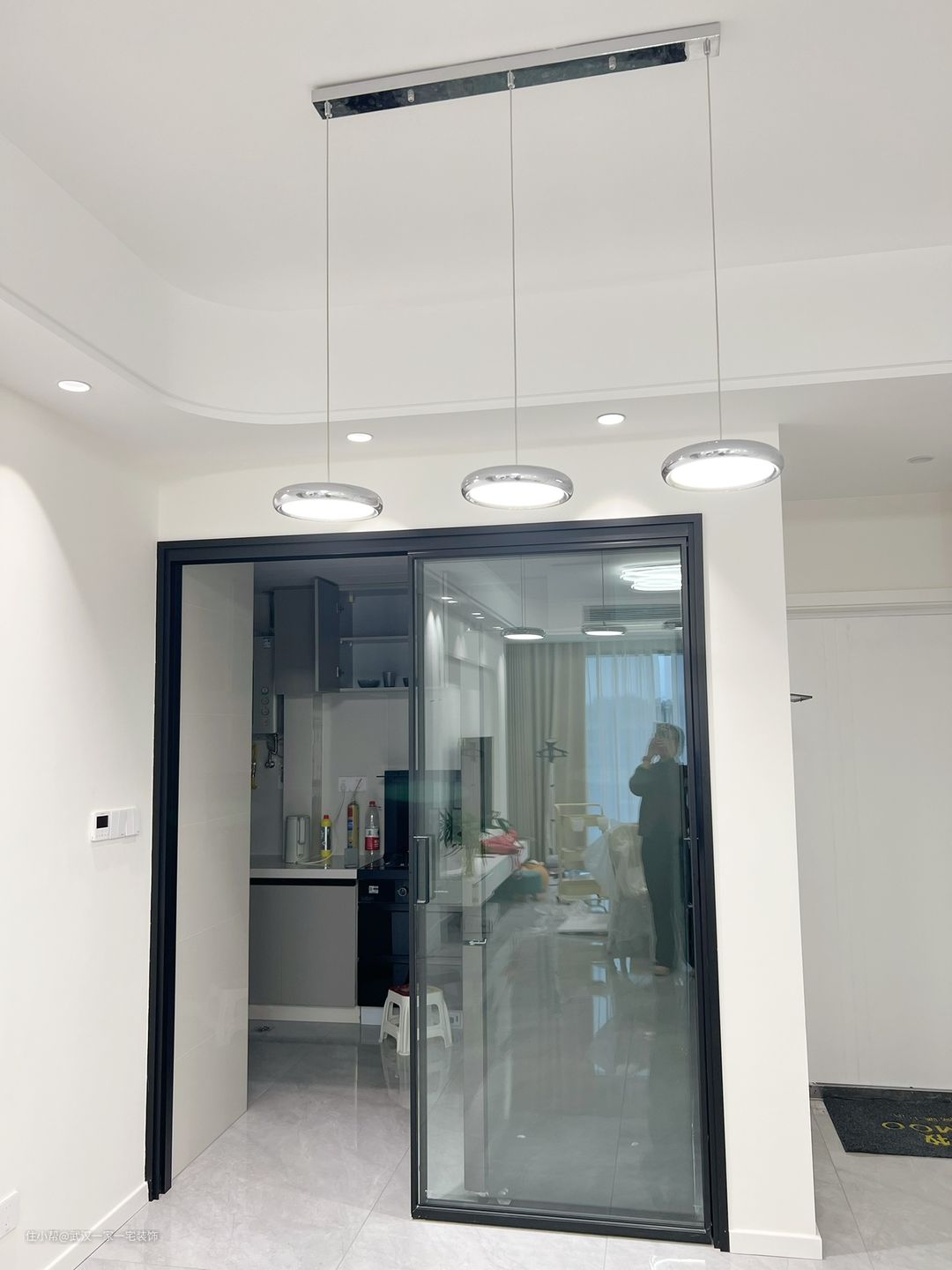 餐厅的白色装有灯带的实木定制柜,中部镂空与玄关部分形成了不对称空间,打破了大白墙的乏味,既增加了收纳空间,又可作为装饰。最特别的是餐桌顶部的三头灯,妥妥的颜值提升小能手,200+就能轻松get的装修好物,加上绿植的点缀,很清新自然。
