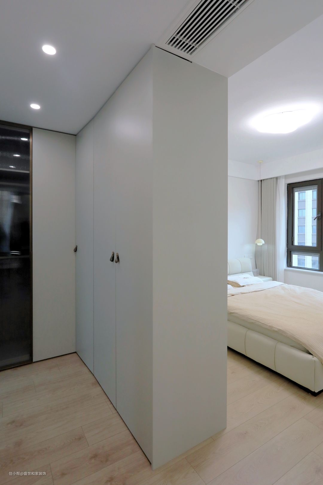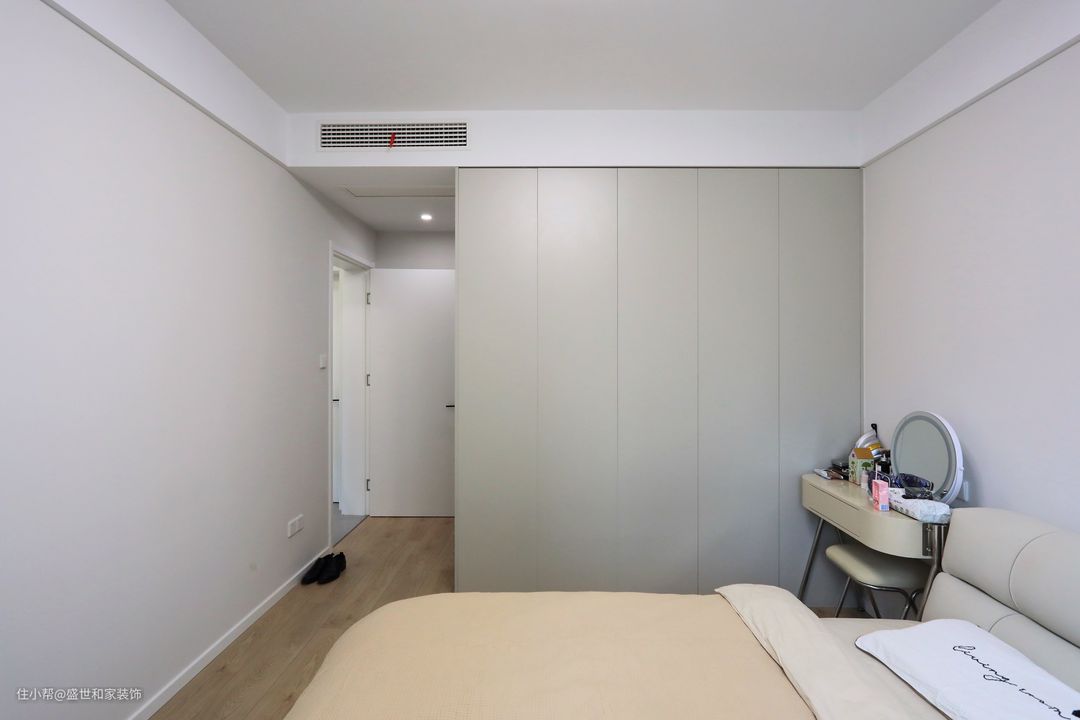 1 主卧为整体套房设计,在原始结构的基础上,利用衣柜做隔断,使衣帽间成为一个独立空间。 2 烟雾灰柜门搭配金属框长虹玻璃柜门,丰富衣帽间层次的基础上,保证空间分布与收纳储存的平衡。