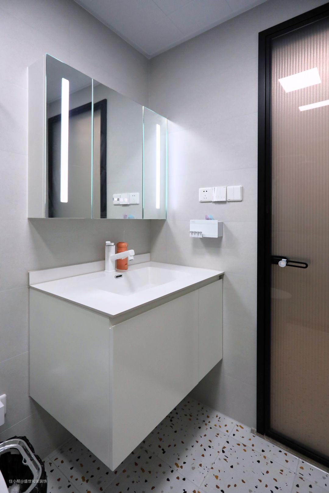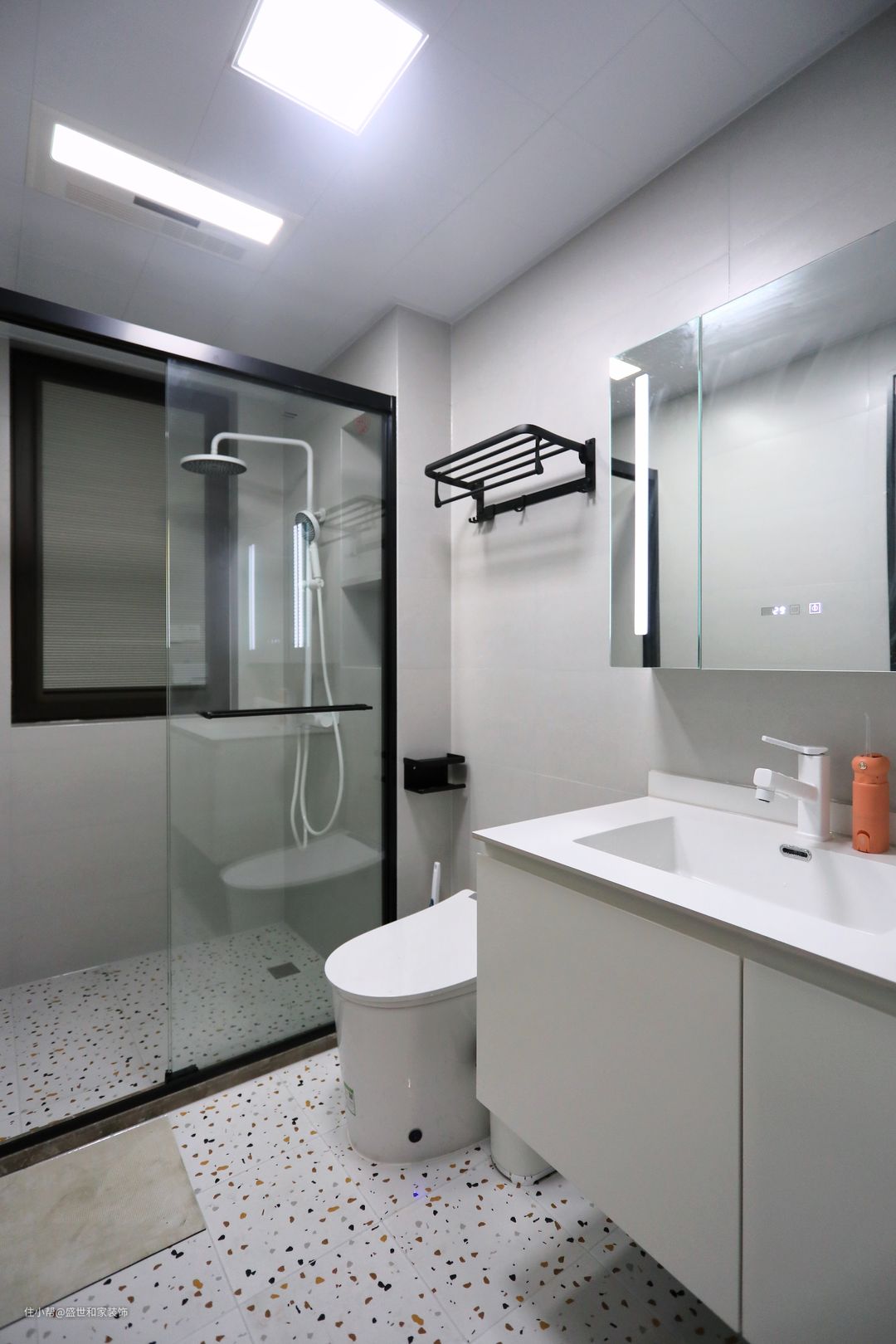 1 卫生间干湿分离,象牙白色调更符合全屋风格,淋浴房墙壁设计壁龛,摆放洗浴用品,空间更加合理化。 2 洗手台面采用台下盆,柜体采用悬空设计,整洁好清理,镜柜自带照明,保证收纳的同时,增加实用性。