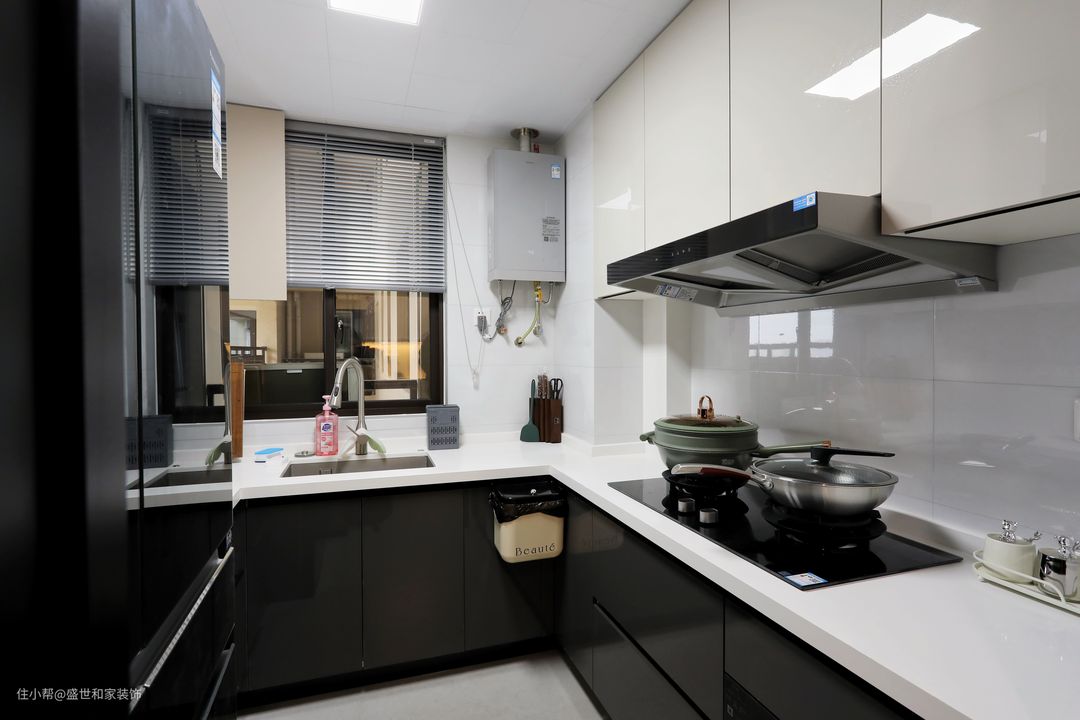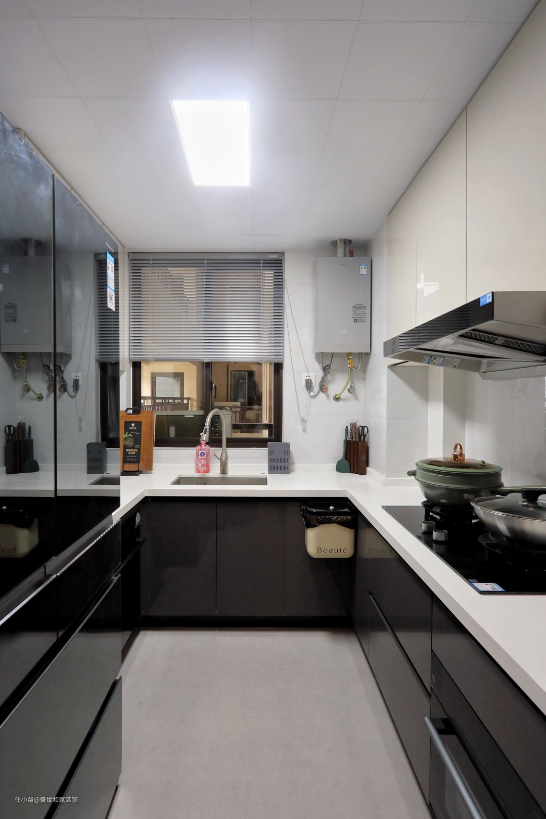 1 厨房与玄关相对,U形厨房格局更符合户型实际与人体工学,洗涤、备餐、烹饪、收纳分区明确,烹饪更加顺手。 2 米白色吊柜与雅致黑地柜充分满足了业主对收纳的需求,上浅下深的配色更显高级感。