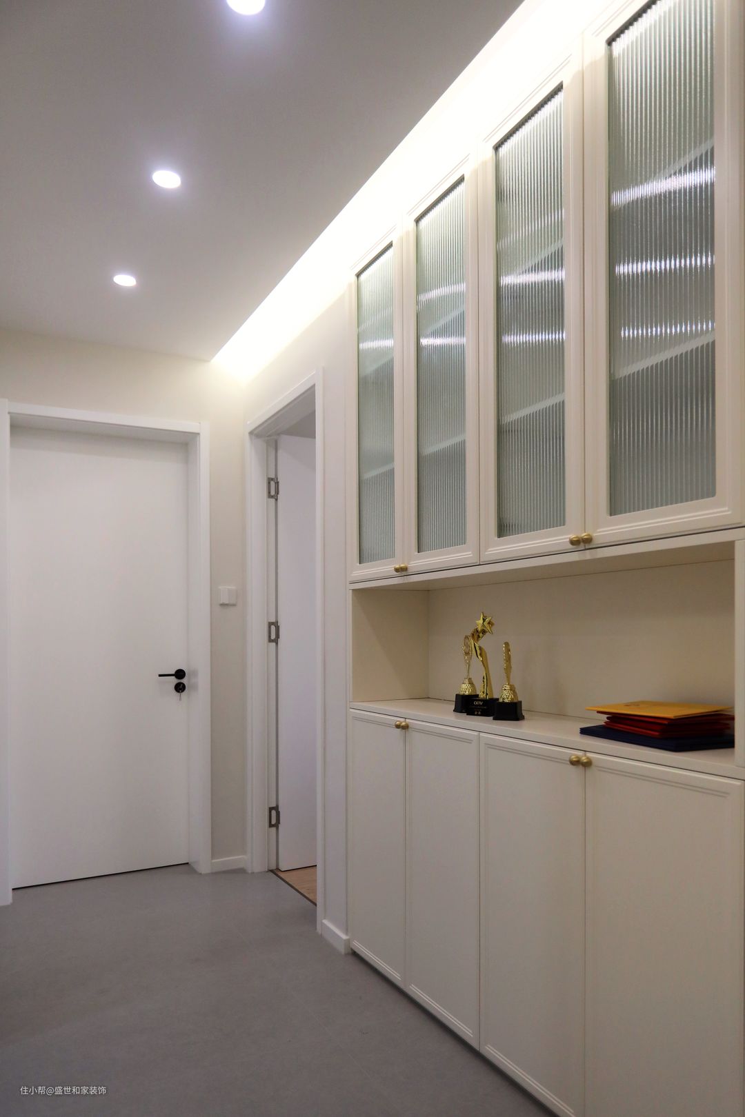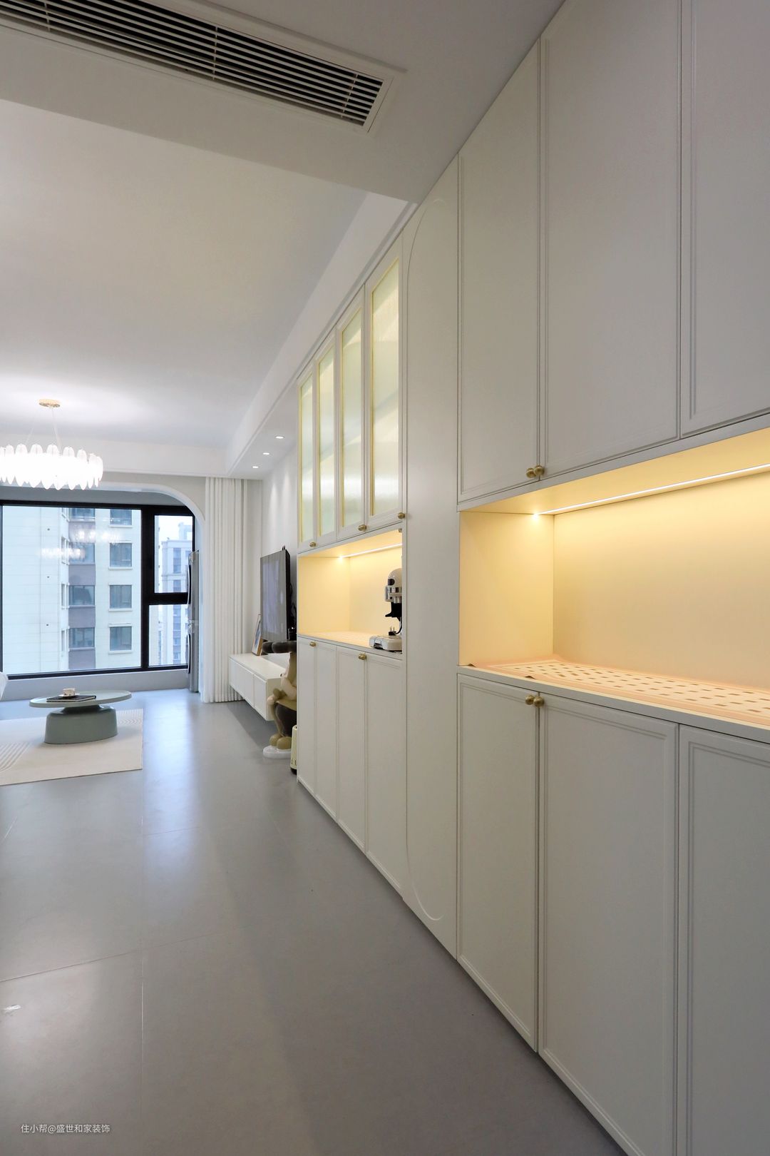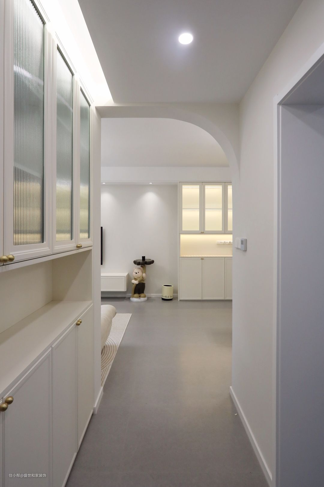 1 走廊主要为过渡客餐厅动区与卧室静区的功能性区域,既为客餐厅分区,又为客餐厅造景。 2 半拱形门洞的曲线设计,一步一景,在视觉上拔高了整体空间感,同时让整个家都显得生动起来。 3 被抹去棱角的空间,每个角落里都藏着温馨,走廊区的整面墙收纳柜上下分段,中部留空,简洁又方便。