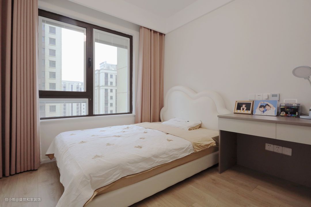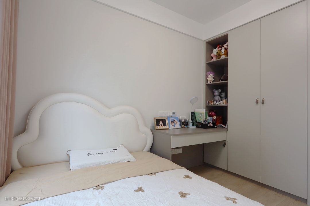1 女儿房增加了粉色与咖色元素,形成恰到好处的温暖,奶白色云朵床,舒适清新,充满童趣。 2 整体衣柜设计加强收纳,一侧增加开放格,与书桌为一体,增加女儿房的功能性,学习休闲两不耽误。