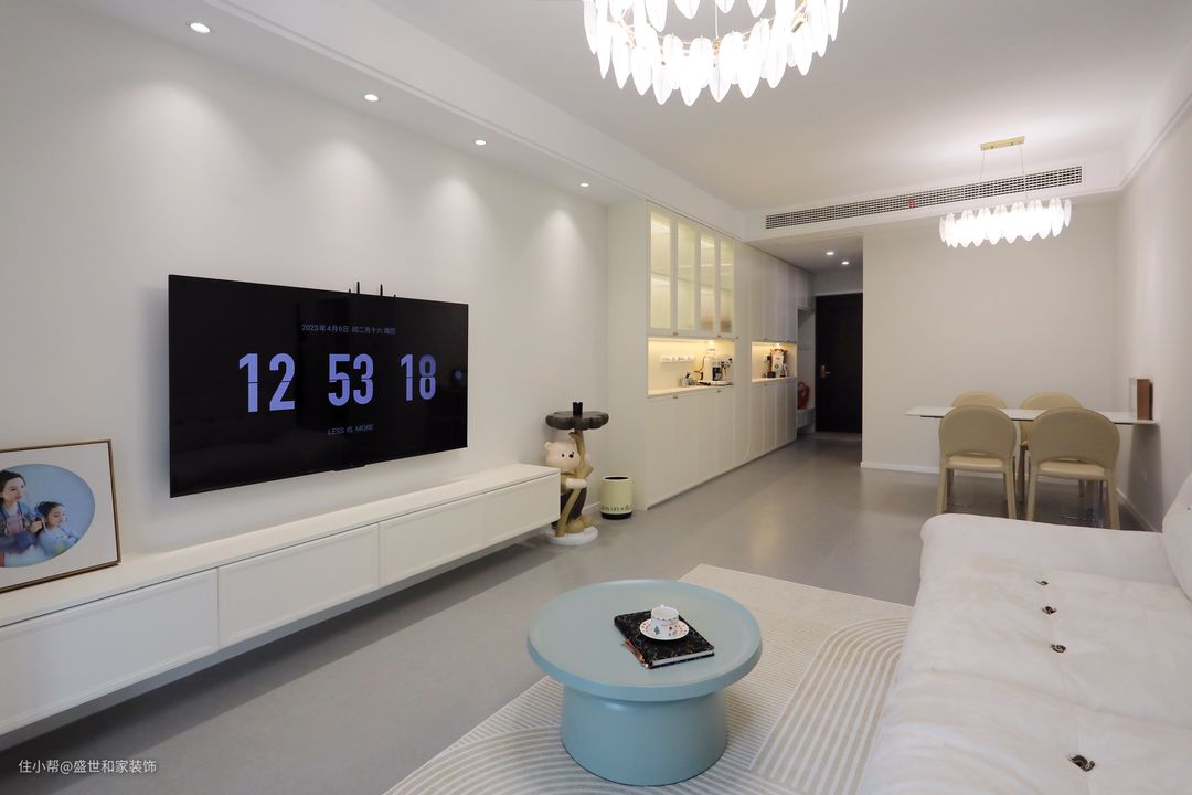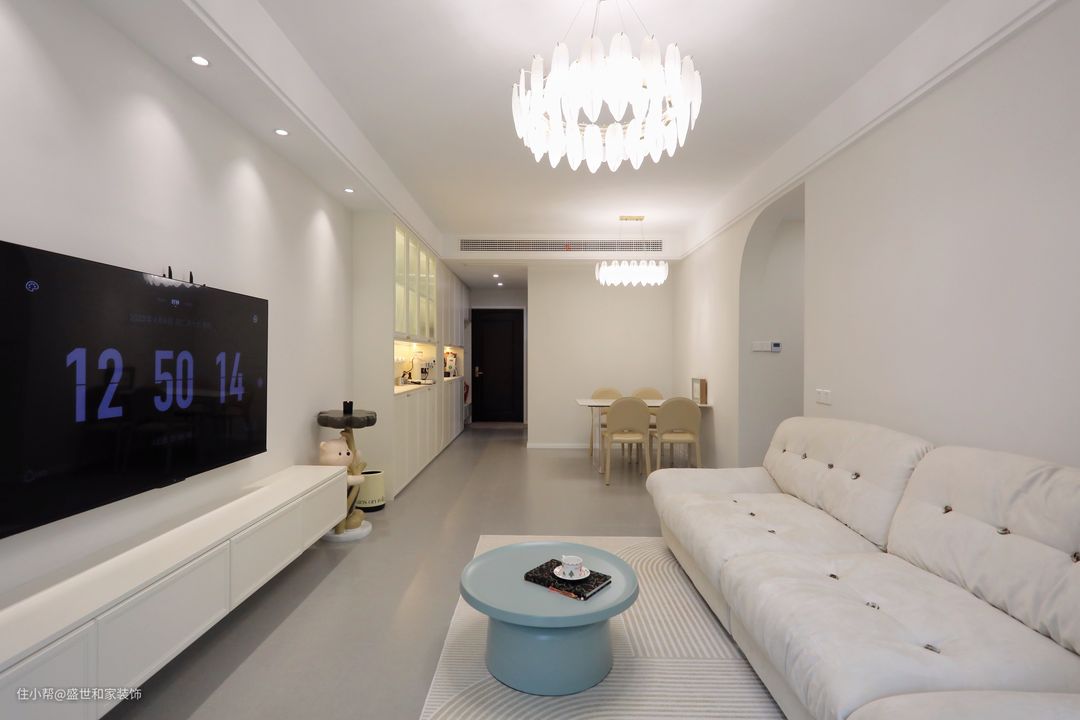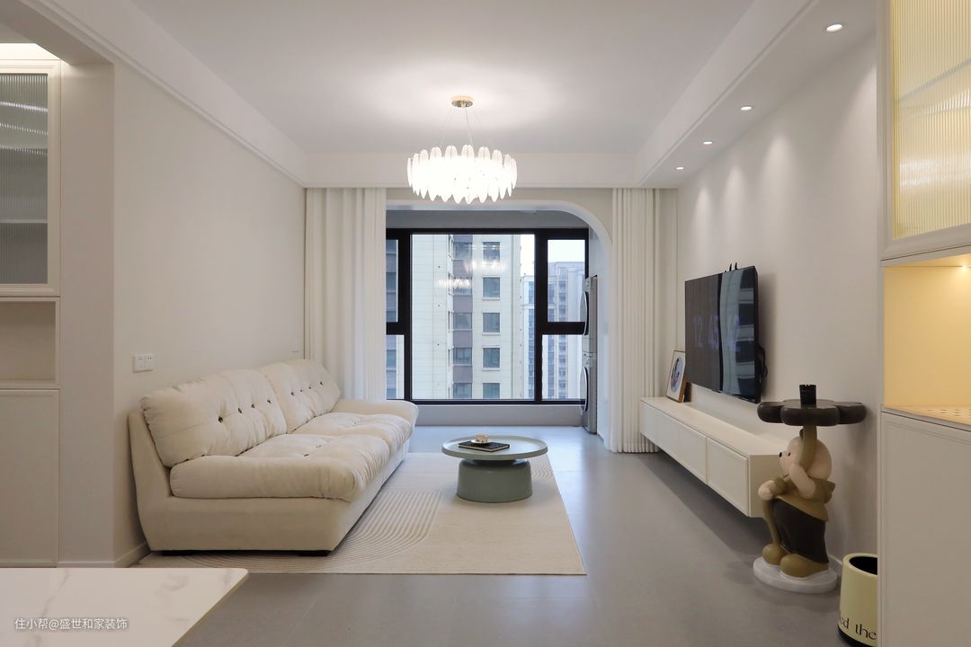 1 由玄关延伸,开放式的客餐厅的布局设计,让人在入户的瞬间就能感觉到视野宽阔,米白色乳胶漆墙面搭配水泥色柔光砖,一眼就沦陷。 2 打开灯,走进去,一头扎进被暖暖的奶油色包裹的屋子,慵懒的窝在柔软的云朵沙发中,瞬间治愈了一天的劳作。 3 电视背景墙简约化,只做悬浮电视柜,没有遮挡与阻碍,空间显得明亮而轻盈。 羽毛吊灯透光且柔和,与电视墙面的射灯形成丰富的层次与深度。 4 阳台与客厅之间,利用拱形门洞做连接与分隔,无门设计,把整个阳台扩入到客厅之中,增加整体空间感。