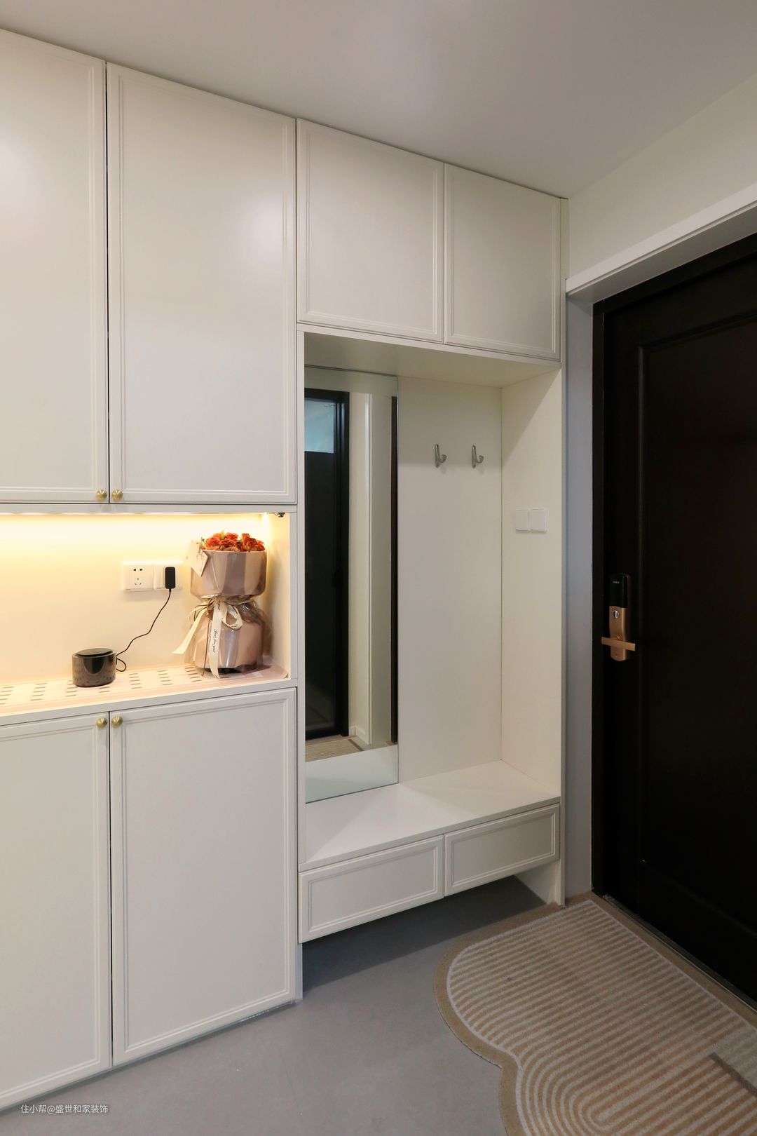 1 入户映入眼帘的便是奶白色的玄关柜,带穿衣镜与换鞋凳的玄关收纳柜,将空间功能合理利用。 2 玄关柜连接储物柜,一体化的设计直通到客厅,在视觉上延伸了玄关的长廊空间,在布局上将收纳最大化。