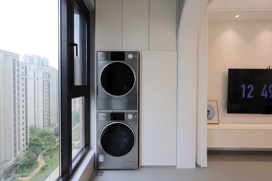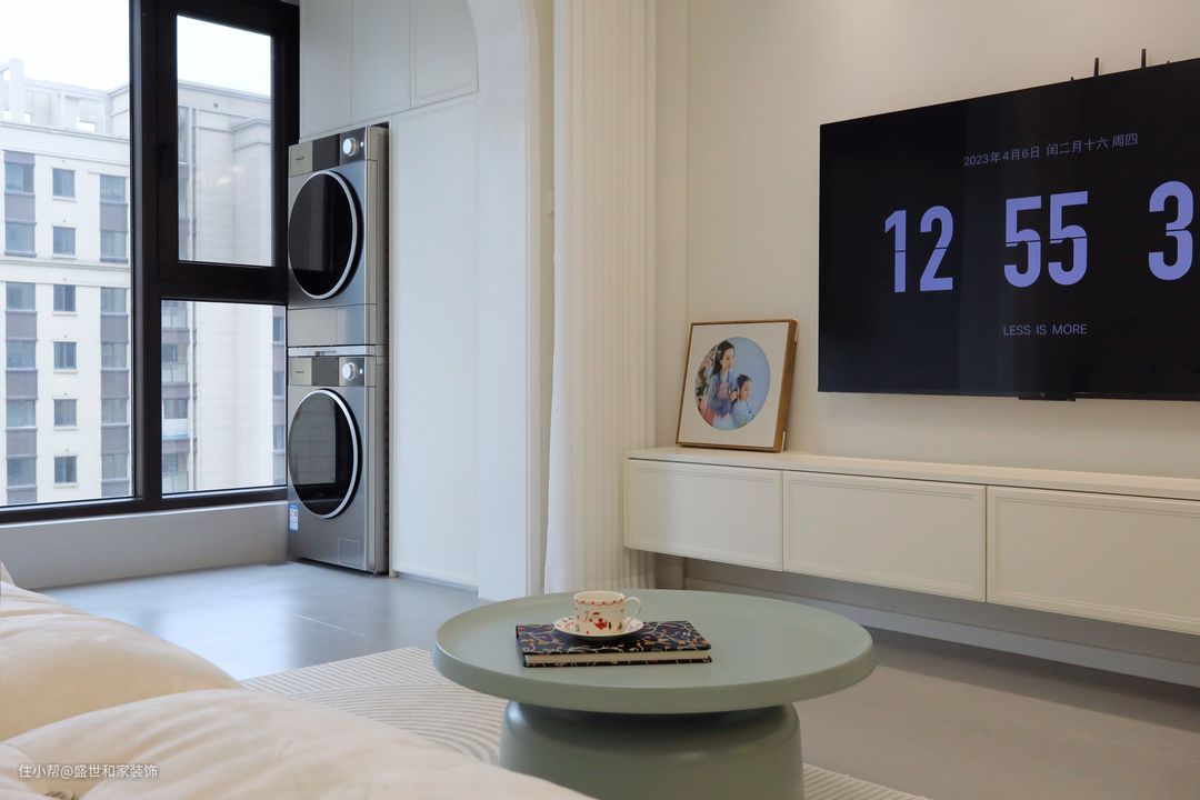 1 封阳台设计,使客餐厅拥有纯粹干净的自然采光,一侧的整面收纳柜,嵌入洗衣机与烘干机,让每一处的空间都利用到极致。