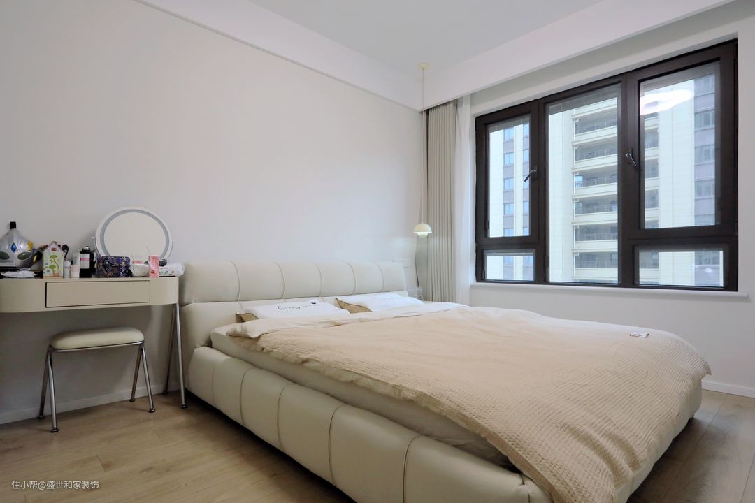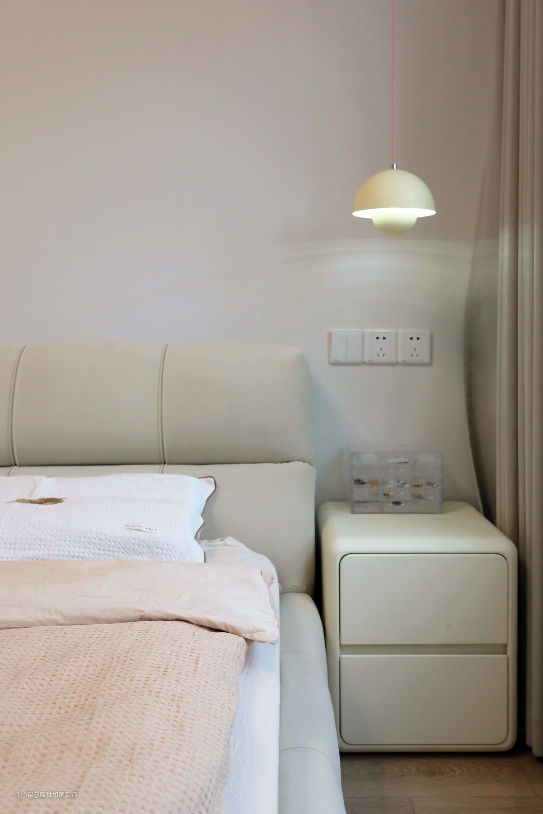 1 主卧延续着全屋的低饱和色度和暖调,柔软的床品提升卧室舒适度,通过视觉与触觉感官的调动,实现生活美感的共融。 2 卧室内换铺柔和温暖的布里亚特木地板,和谐的色调流露出浓郁的生活品质感。 3 床头垂落的吊灯彰显着屋主对生活品质的追求,奶白色床头柜与软包床头呼应搭配,整体性与美观性更高。