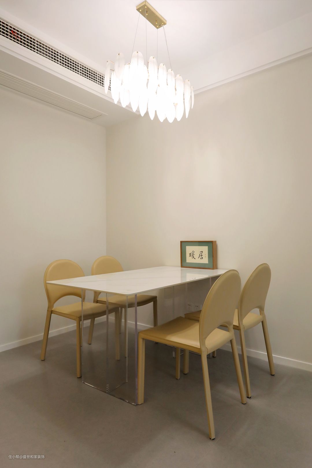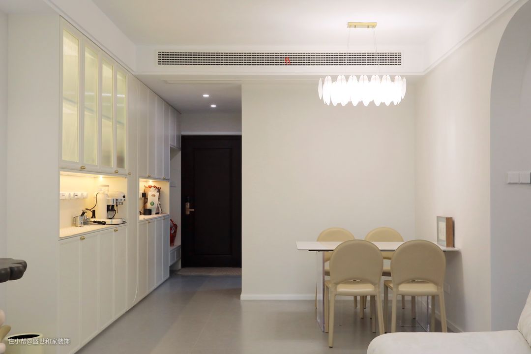 1 开放式的客餐厅布局,增进空间交流,地面通铺柔光砖,流露出裸调高级质感。 2 整体的奶油米色,与纯白色相比,更为温柔,整体墙面的留白,使得空间更加干净利落。 3 四人座的餐桌椅以简约为主,色调暖与材质暖的交融,承载着一家的人间烟火气。
