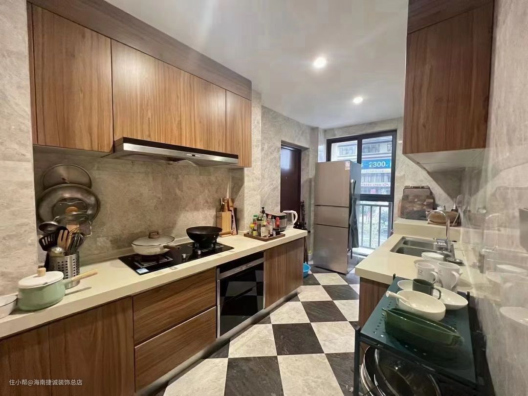 厨房延续了深棕色的主色调,过道式的厨房,两边都做了一字型橱柜,这样会让整体厨房都显得比较宽敞。