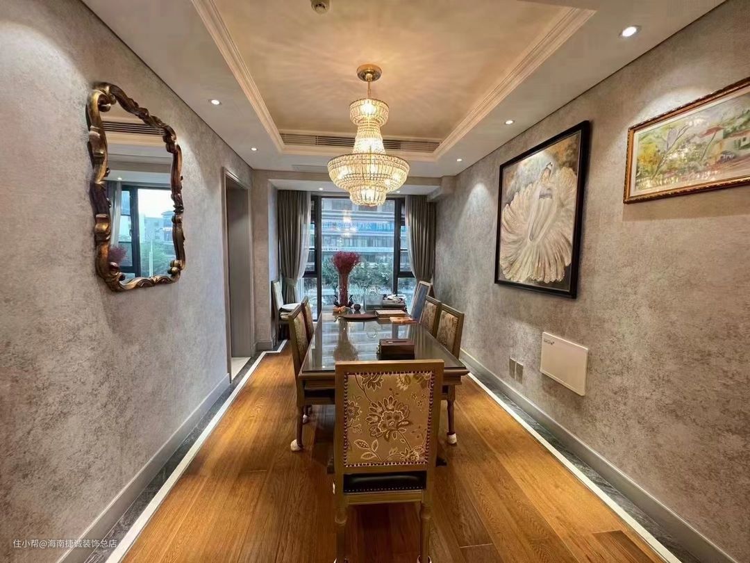 餐厅在客厅一旁,一脉传承的美式风格, 采用深棕色餐桌搭配实木皮质餐椅,吊灯与墙面也是非常有美式特色的。
