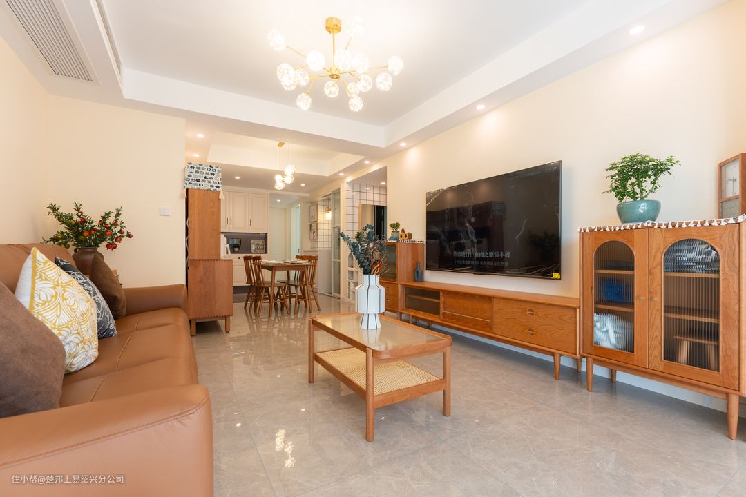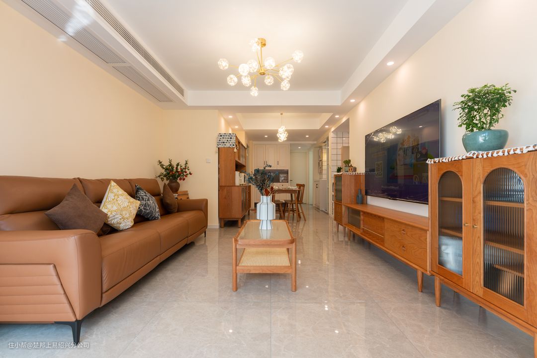 从玄关慢慢步入客厅,细腻舒适的奶油色客厅、轻巧的原木家具、独特的复古咖色沙发,让视觉更加轻盈,空间更加通透。墙角那一抹绿意,就像是画龙点睛的一笔,让整个客厅都变得鲜活起来。 阳台门拆掉,将阳台包进客厅,装上落地窗,阳光照射进来,让房间里的光线变得很好,在视觉上也延伸了整个客厅的空间。