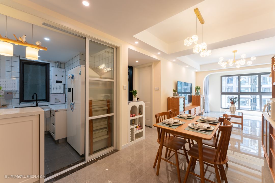 随处可见的艺术装饰画和卡通元素是营造独特复古感的氛围担当,半开放U型厨房设计,动线清晰;透明推拉门,既将厨房里的油烟隔离,又让整个厨房看起来更加明亮、宽敞。