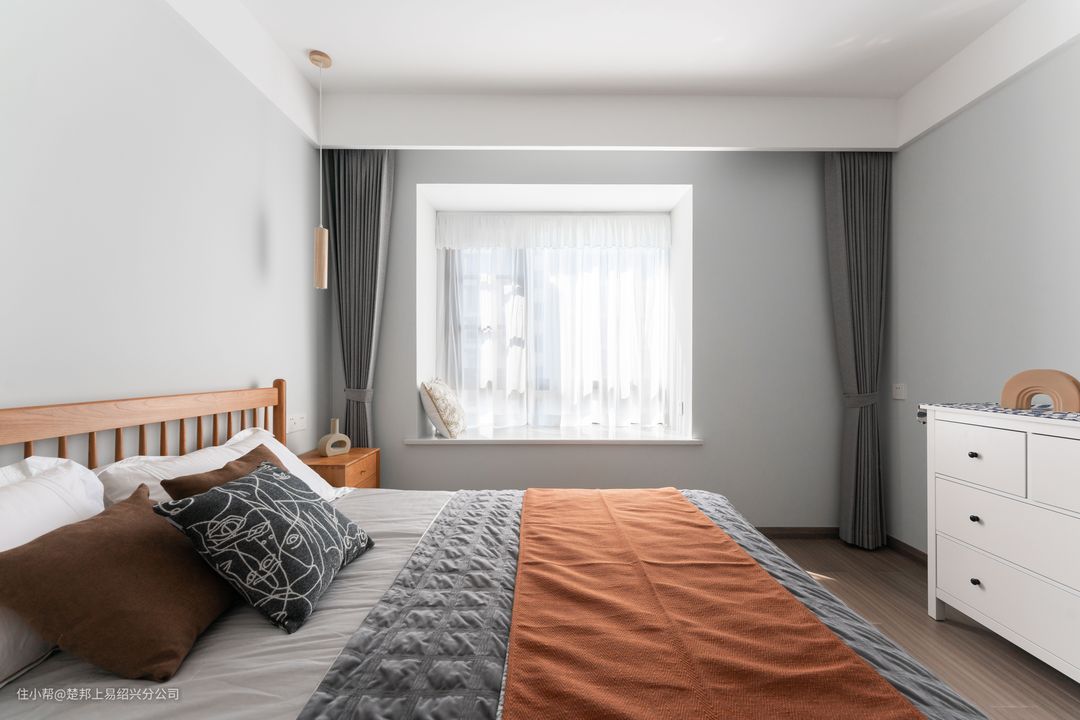 推开房门引入眼帘的是温柔舒适的主卧,主卧以白色和浅灰色为主色调,橙色和深灰色作为辅助色调,室内整体氛围明快、高级。全屋浅灰色乳胶漆通刷,搭配复古原木床,简约又个性。 入门处的收纳柜和衣柜满足女主人的收纳需求,浅灰搭配烟粉,在高级中多了一份活泼。