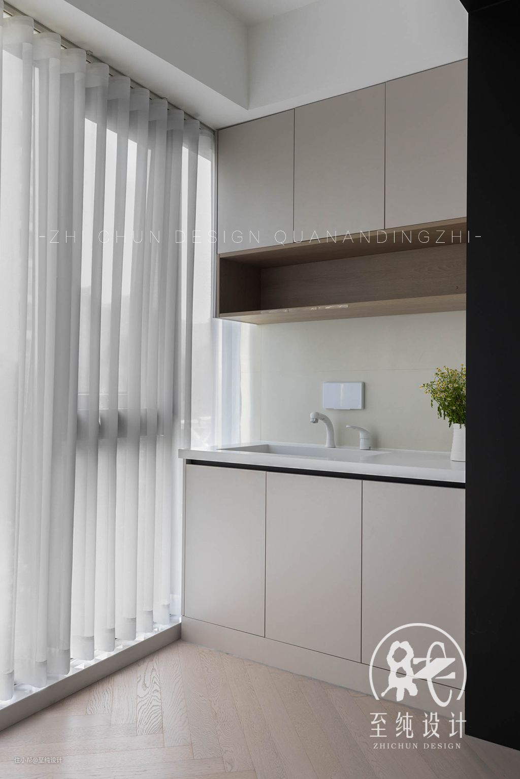 基于家里小物件较多,客厅的收纳集中在电视背景墙,一整排的电视加储物柜形式,收纳规整活泼成长期小朋友的玩具与各种书籍。结合客厅的释放空间,让客户不仅仅只是客厅,阅读、玩耍、亲子互动等等都能兼容,通过设计布局开发扩大空间多功能性。 把原始客厅与阳台之间的移门丢弃打通,达到与阳台贯通的目的,扩大客厅左右空间。 根据屋主的需求及生活习惯,阳台兼具日常家务区与休闲区,左右两侧集洗衣机烘干机上下叠放,洗地机等,借四边空间余额增设收纳柜,既让生活用品规划收纳到此处,家务动线也更流畅。 从阳台看餐厅,将厨房内缩,玻璃移门隔断厨房油烟与公共空间,释放更多空间给餐厅。 重整后的布局,借玻璃的通透及房门的朝向,无论是厨房与客厅,还是餐厅与客厅都可以形成南北通风格局,空间纵深感更大,进门通透性更强。