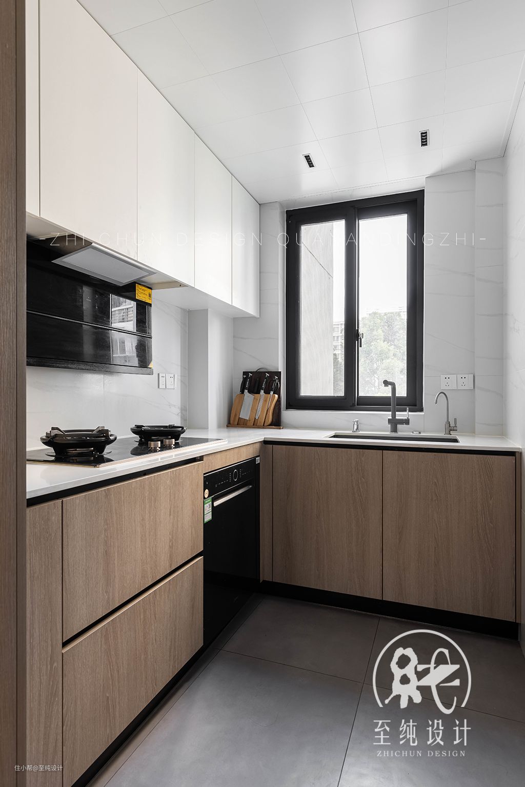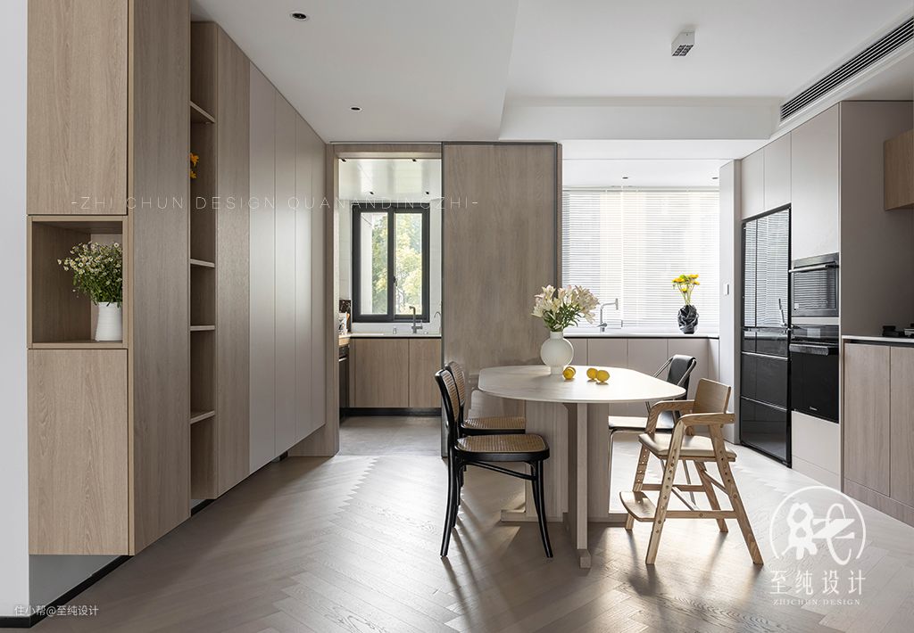 从入户看餐厅及西厨区。 借助释放后的空间,将厨房改为中西厨方式,中厨内缩,西厨借北阳台及餐边柜实现,集合存放、烘烤、咖啡、茶饮等功能,而入户转角区域定制鞋柜及生活收纳柜,餐桌居中摆放,既扩大厨房台面面积,两侧的收纳及餐边柜让储物功能格外强大。 半开放式的中厨、完全开放的西厨、餐厅、客厅,日常父母中厨制作一日三餐、男主人手冲咖啡、女主人和小朋友客厅阅读娱乐等,作为家里的核心空间,互通有无、自由流通的公共区域,既拉近了各功能空间的距离,又增强了亲子间的情感交流,满足整个家庭的居住需求同时,让房子与家庭一起成长。 中西厨的厨房设计,考虑到一日三餐美食烹饪的操作感,及经常清洗水果、水杯等,西厨增排水槽,日常功能的使用更便利,动线也更方便。