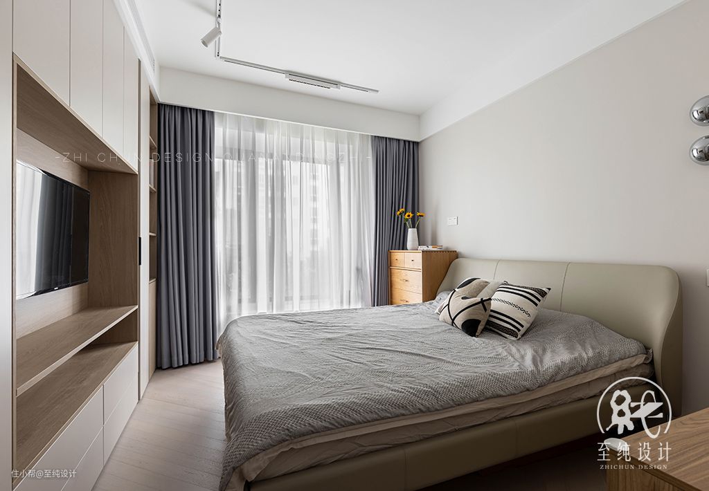 主卧套间设计,主卫保留基本功能,释放更多空间给到主卧活动区域。床对面定制一排衣物收纳柜,并与梳妆台相结合,入户房门打开后,视野开阔,所看区域没有任何高柜遮挡,视线所及整个卧室的空间更整齐划一,功能上提高空间利用率。而一排成形的定制柜扩大增强收纳储物的同时,间接扩大床两侧活动空间,行动更为便利。