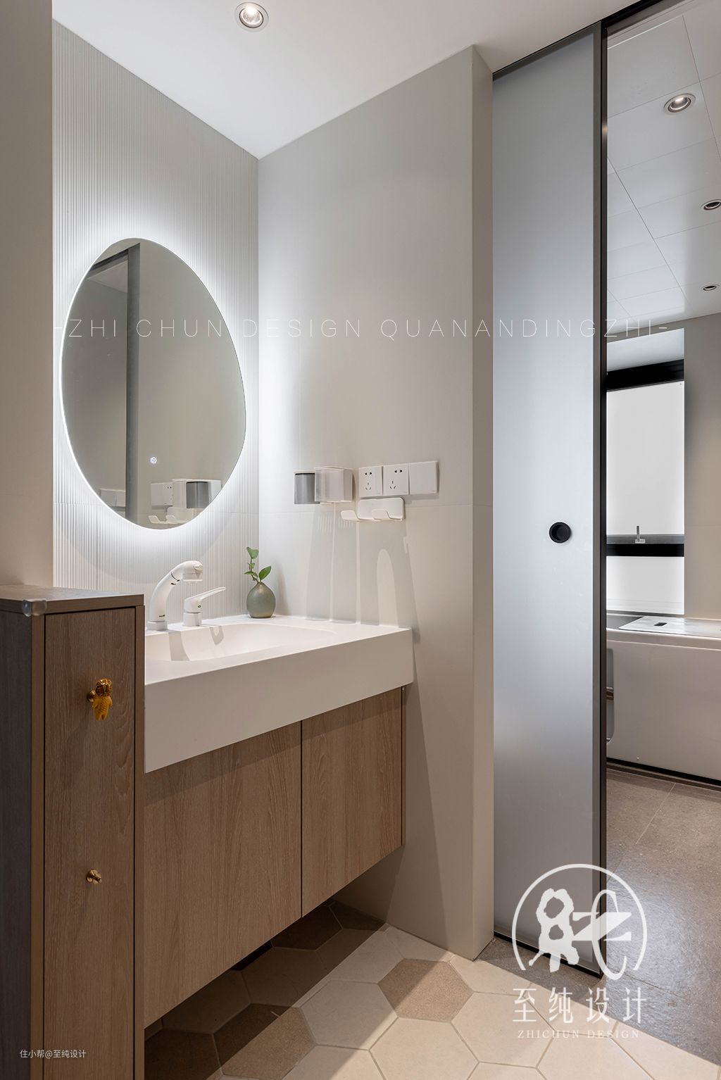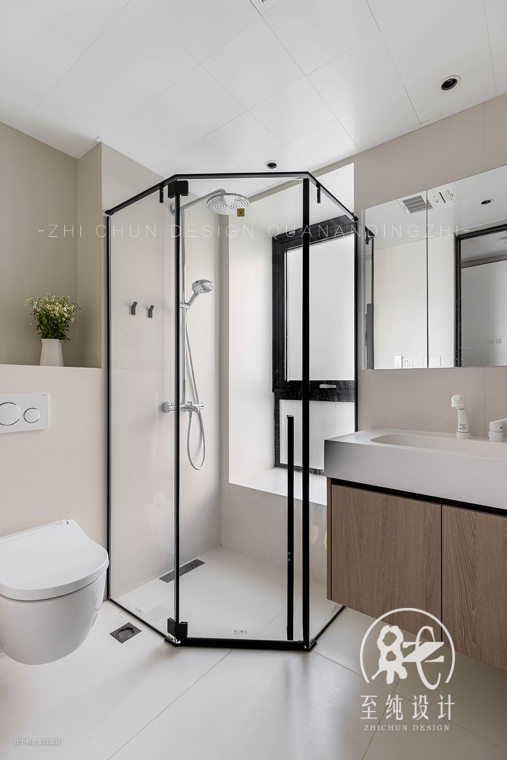 客卫是干湿分离的设计,工艺上去掉传统的门槛石及挡水条,采用地砖直铺淋浴区域下沉的办法,借坡度解决排水问题。干净利落的通铺设计日常打理起来更为方便,不再为拐拐角角的卫生死角头痛,大大减轻了清洁负担。