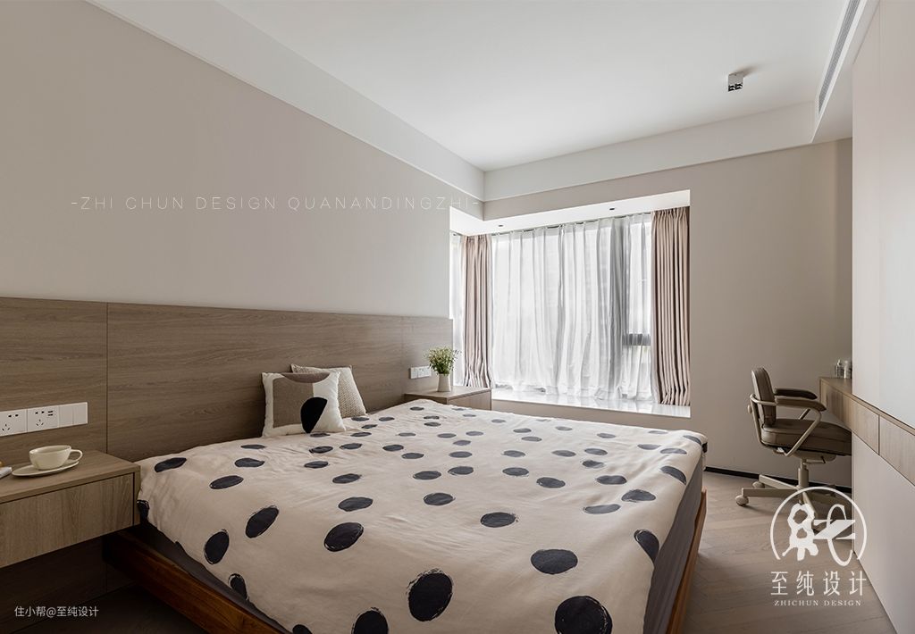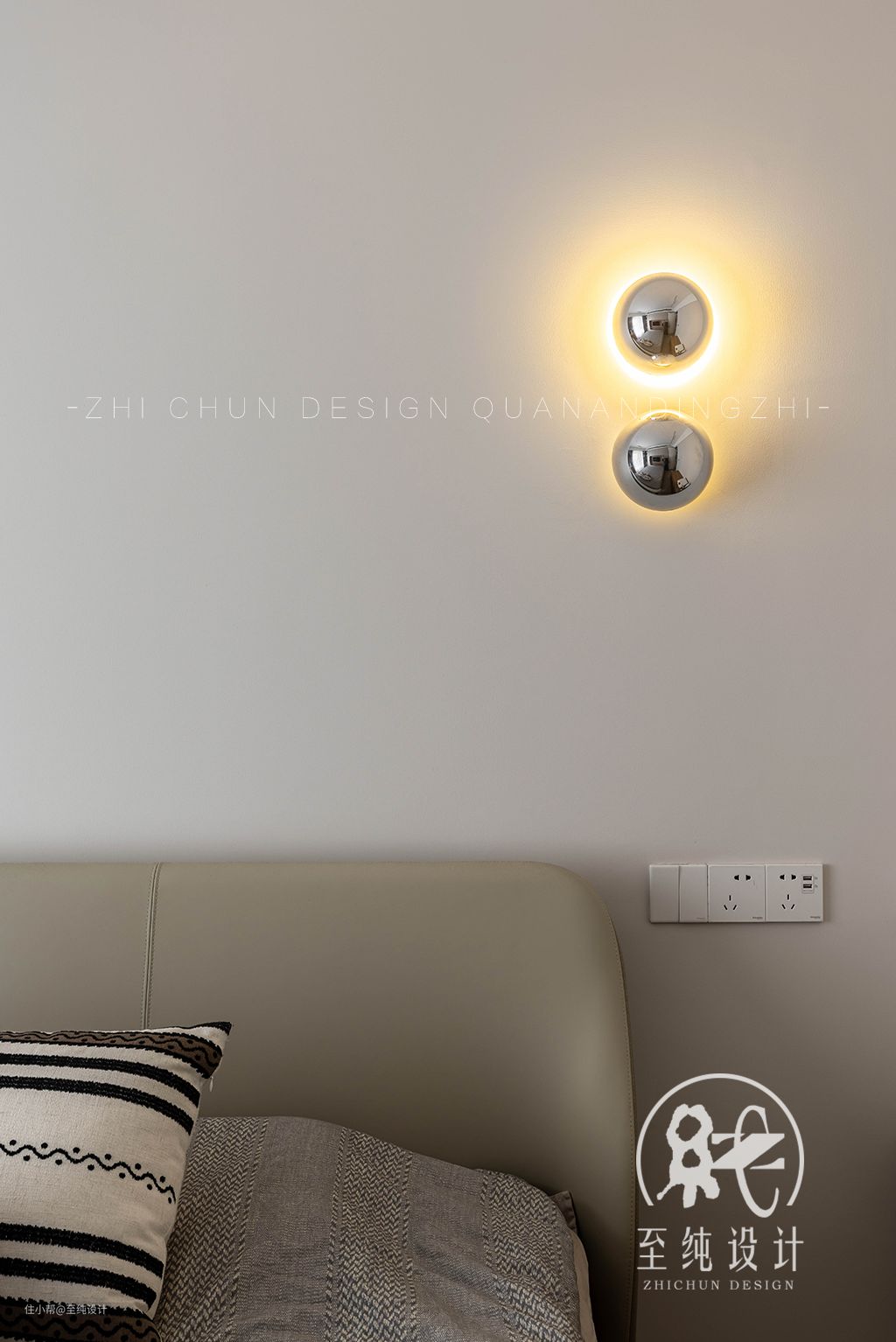 主卧套间设计,主卫保留基本功能,释放更多空间给到主卧活动区域。床对面定制一排衣物收纳柜,并与梳妆台相结合,入户房门打开后,视野开阔,所看区域没有任何高柜遮挡,视线所及整个卧室的空间更整齐划一,功能上提高空间利用率。而一排成形的定制柜扩大增强收纳储物的同时,间接扩大床两侧活动空间,行动更为便利。