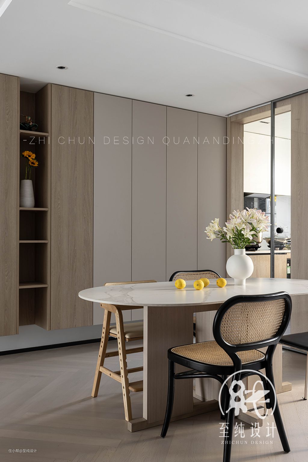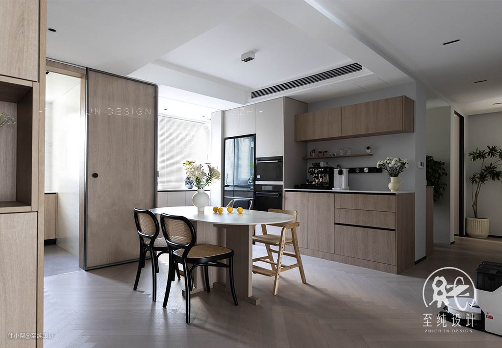 从入户看餐厅及西厨区。 借助释放后的空间,将厨房改为中西厨方式,中厨内缩,西厨借北阳台及餐边柜实现,集合存放、烘烤、咖啡、茶饮等功能,而入户转角区域定制鞋柜及生活收纳柜,餐桌居中摆放,既扩大厨房台面面积,两侧的收纳及餐边柜让储物功能格外强大。 半开放式的中厨、完全开放的西厨、餐厅、客厅,日常父母中厨制作一日三餐、男主人手冲咖啡、女主人和小朋友客厅阅读娱乐等,作为家里的核心空间,互通有无、自由流通的公共区域,既拉近了各功能空间的距离,又增强了亲子间的情感交流,满足整个家庭的居住需求同时,让房子与家庭一起成长。 中西厨的厨房设计,考虑到一日三餐美食烹饪的操作感,及经常清洗水果、水杯等,西厨增排水槽,日常功能的使用更便利,动线也更方便。