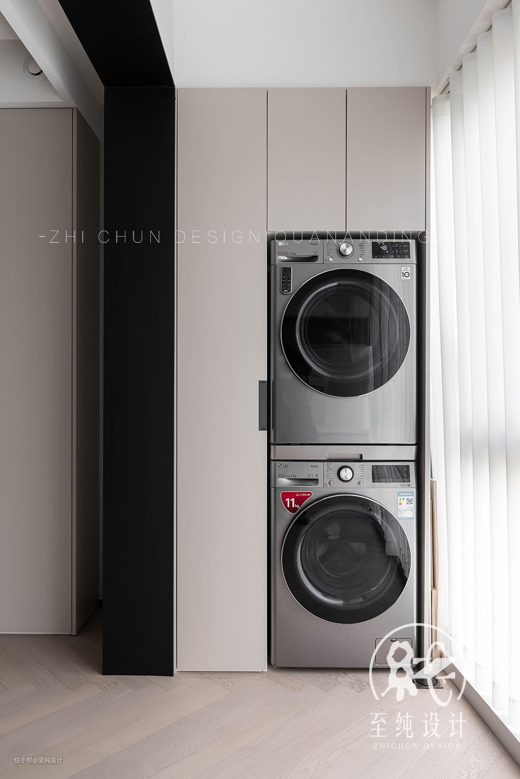 基于家里小物件较多,客厅的收纳集中在电视背景墙,一整排的电视加储物柜形式,收纳规整活泼成长期小朋友的玩具与各种书籍。结合客厅的释放空间,让客户不仅仅只是客厅,阅读、玩耍、亲子互动等等都能兼容,通过设计布局开发扩大空间多功能性。 把原始客厅与阳台之间的移门丢弃打通,达到与阳台贯通的目的,扩大客厅左右空间。 根据屋主的需求及生活习惯,阳台兼具日常家务区与休闲区,左右两侧集洗衣机烘干机上下叠放,洗地机等,借四边空间余额增设收纳柜,既让生活用品规划收纳到此处,家务动线也更流畅。 从阳台看餐厅,将厨房内缩,玻璃移门隔断厨房油烟与公共空间,释放更多空间给餐厅。 重整后的布局,借玻璃的通透及房门的朝向,无论是厨房与客厅,还是餐厅与客厅都可以形成南北通风格局,空间纵深感更大,进门通透性更强。