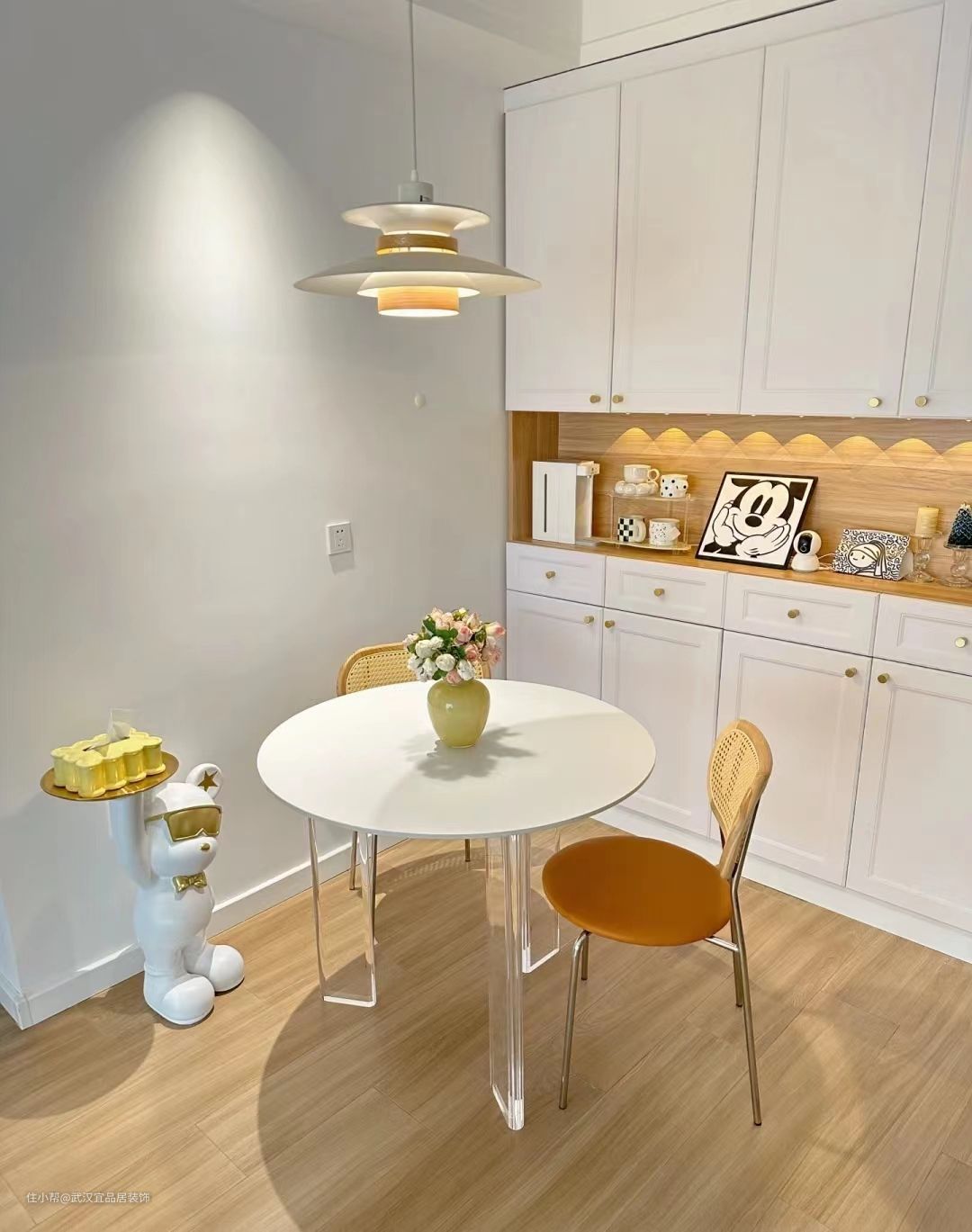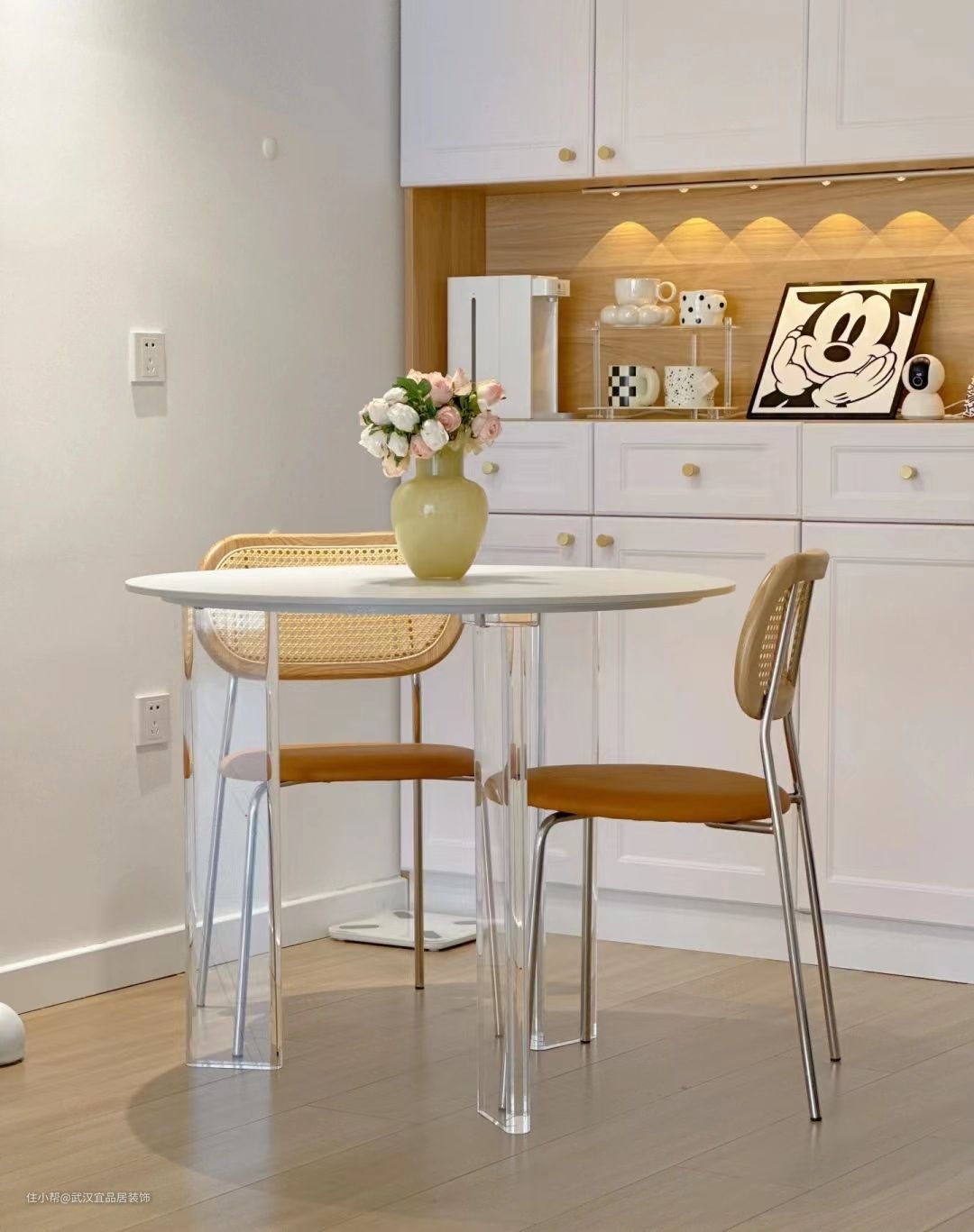 餐厅空间有限,做了一排餐边柜增加收纳,纯白岩板圆形悬浮餐桌,亚克力桌腿更通透,岩板桌面防污好打理