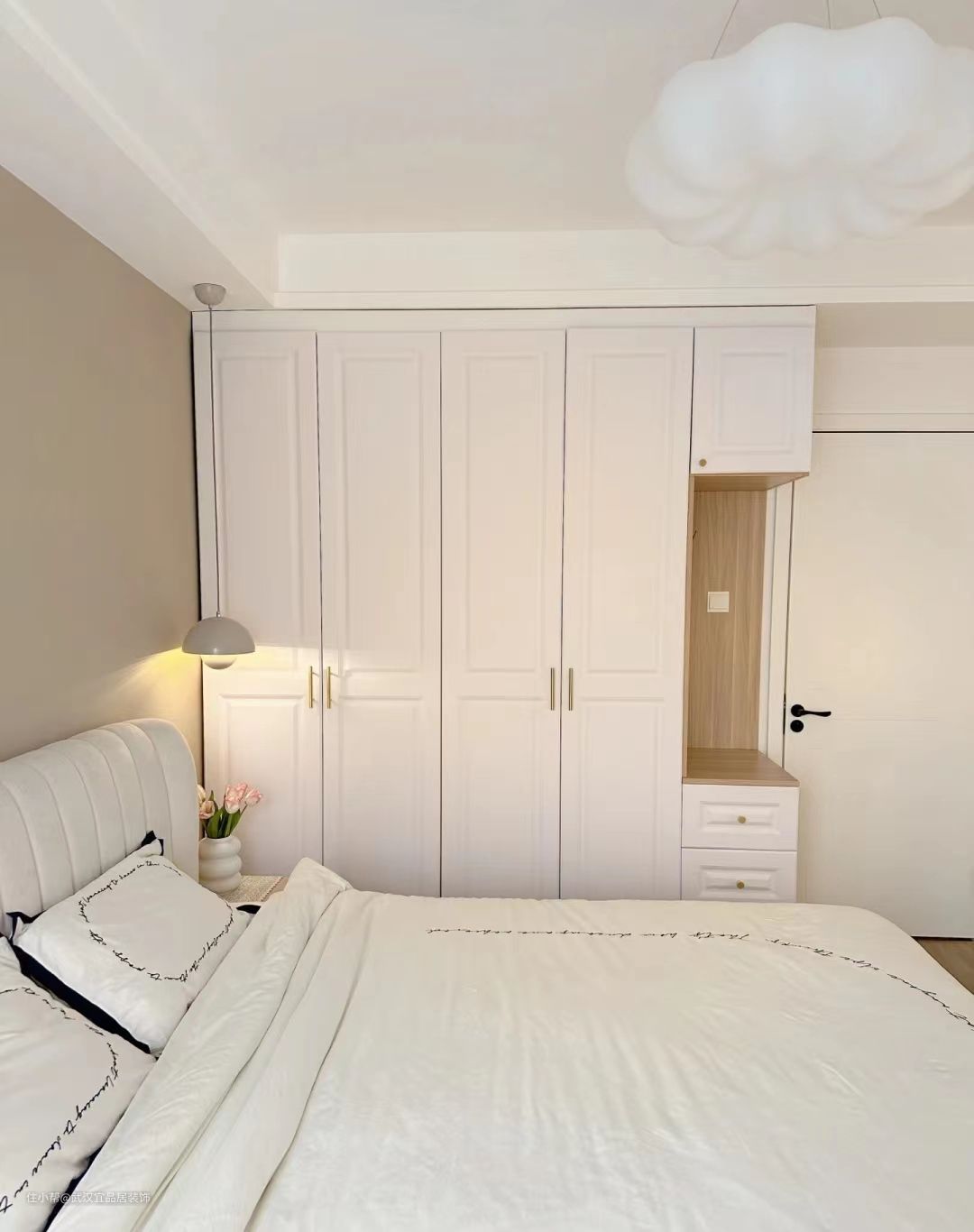 简单的双眼皮吊顶,留了窗帘盒,背景墙刷了布莱垦棕,一门到顶的衣柜侧面做了挂衣区更实用