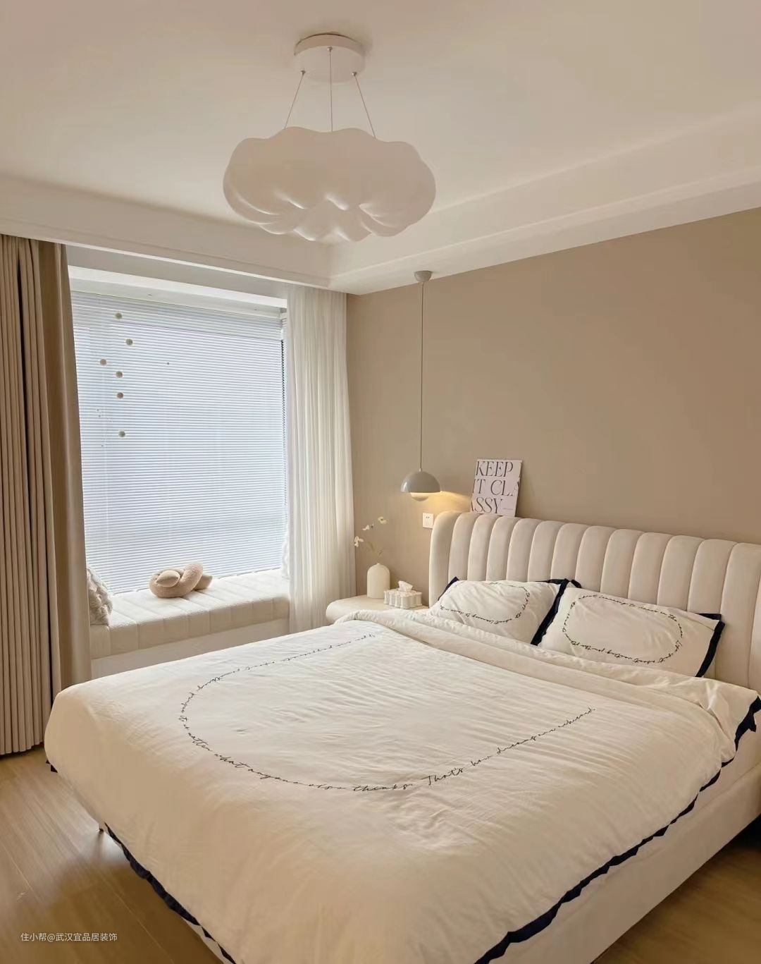 奶茶色窗帘和奶白色软包床呼应背景墙,整体简单又温馨,床尾斗柜化妆桌,不浪费空间,增加收纳