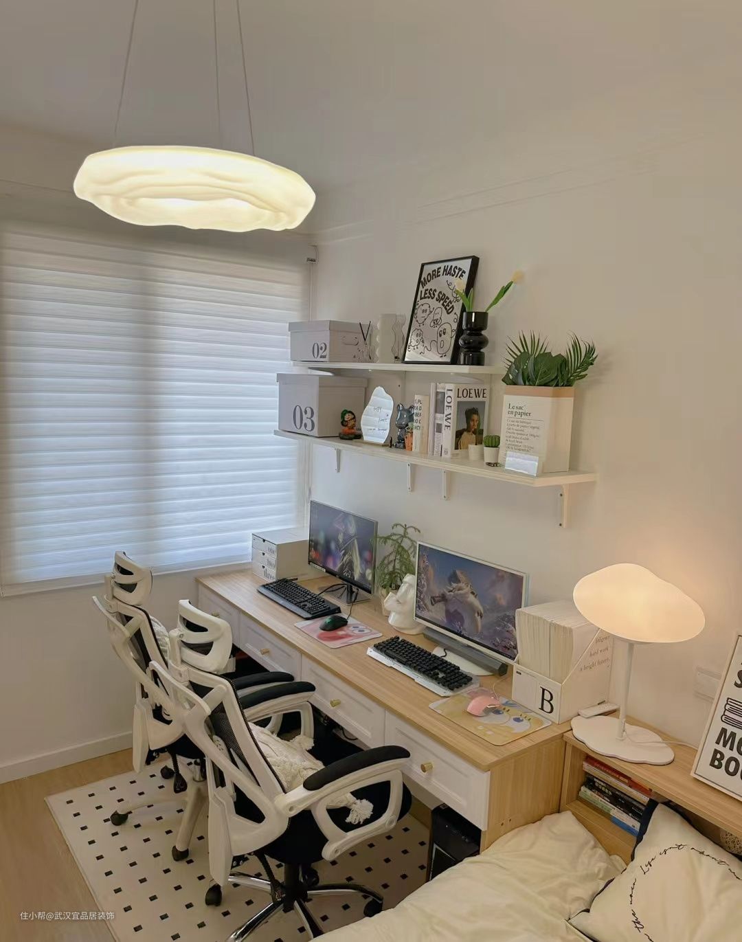 全屋大白墙,只做了双眼皮石膏线,榻榻米收纳很棒,双人书桌办公休闲两不误