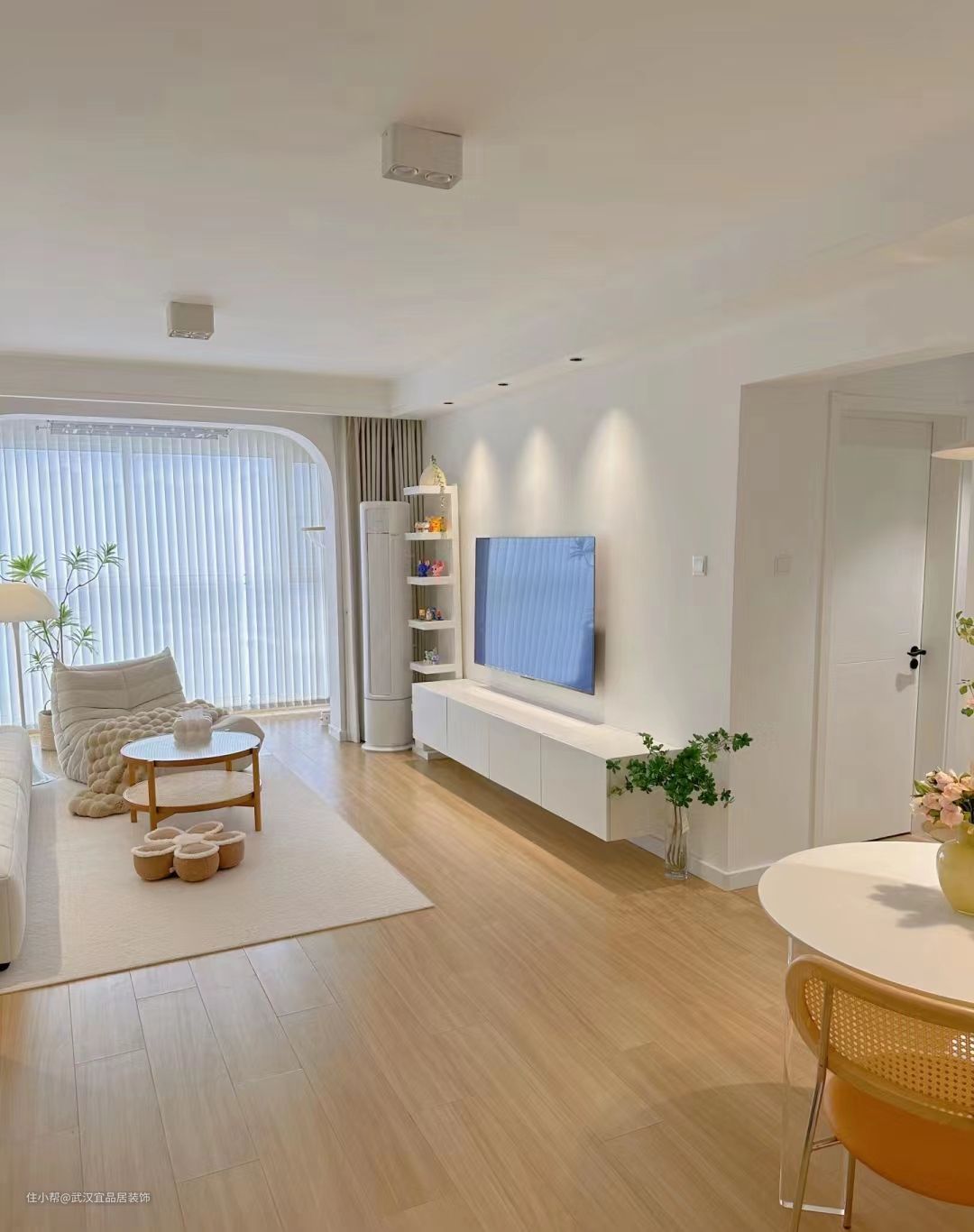 地面木纹砖通铺显大还温馨,不做复杂背景墙,大白墙简单又耐看,简单的双眼皮吊顶搭配无主灯设简单耐看,不压层高不积灰,悬空电视柜卫生好打理