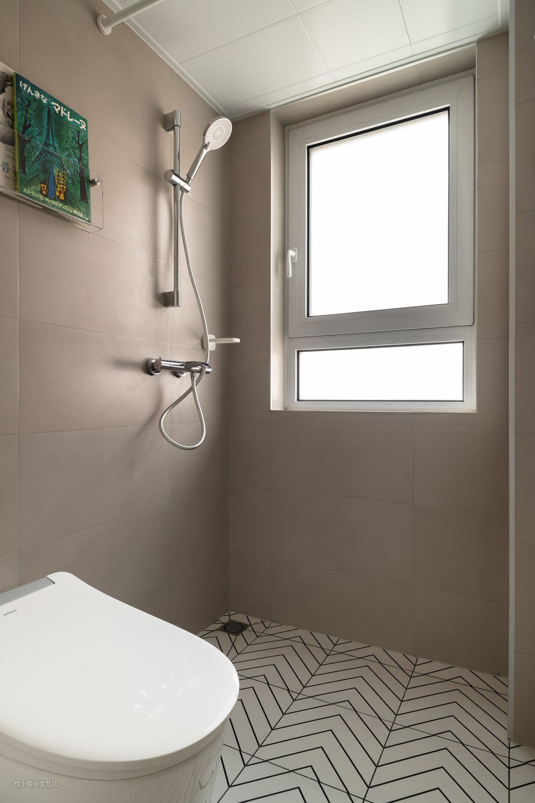 卫浴做了两分离,餐厅旁边就是干区,浴室柜上放置了屋主的洗漱用品和护肤品,置物架和底柜补充了收纳,圆形的智能镜增添氛围感。 精妙的点在于复古的墙纸和玻璃砖,将这里隔成了一个独立不被打扰的小空间,既是浴室柜也是梳妆台。 与干区截然相反,马桶和花洒打造的湿区非常简洁,也是便于清洁。灰色墙面,搭配折线形地砖,高级感油然而生。