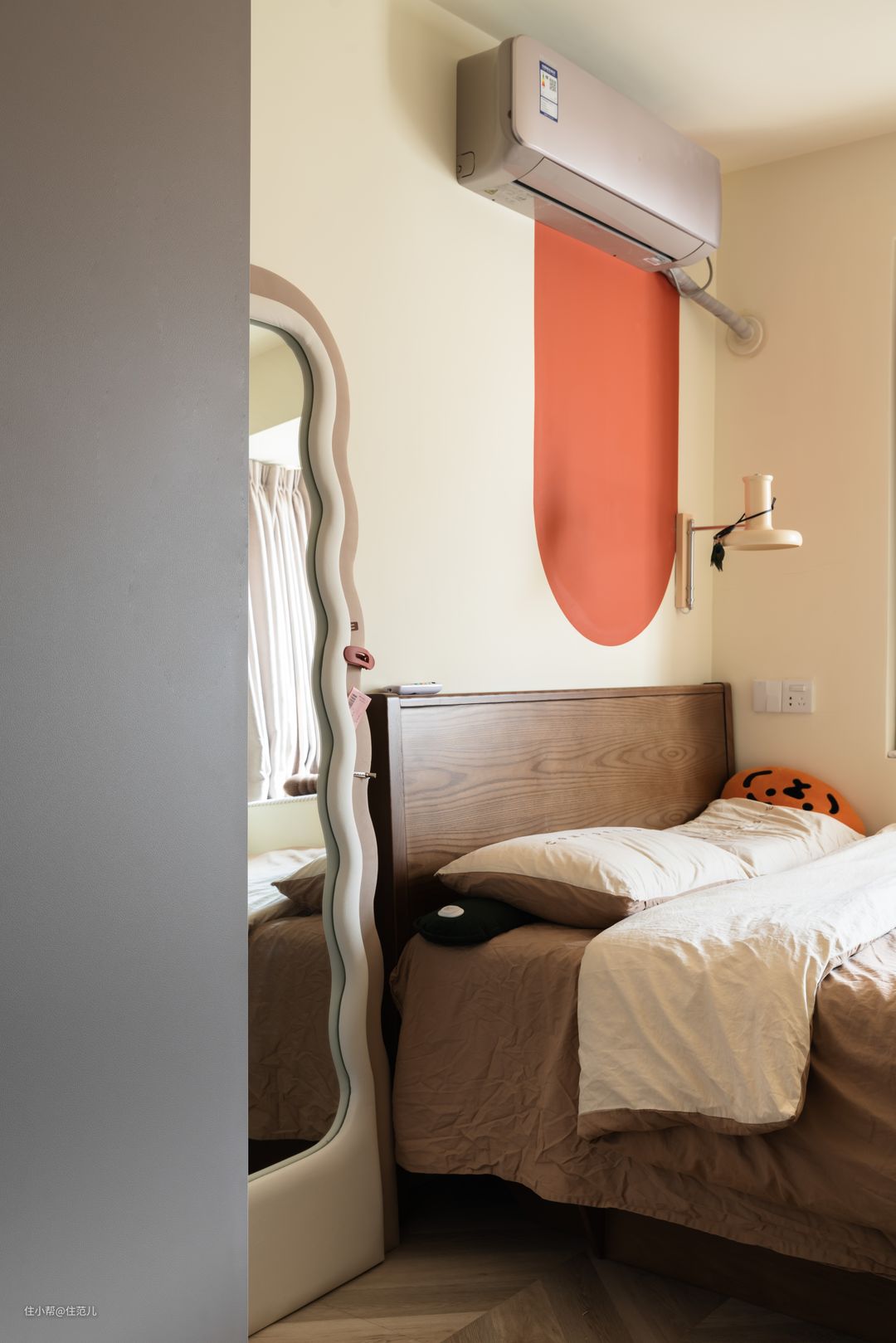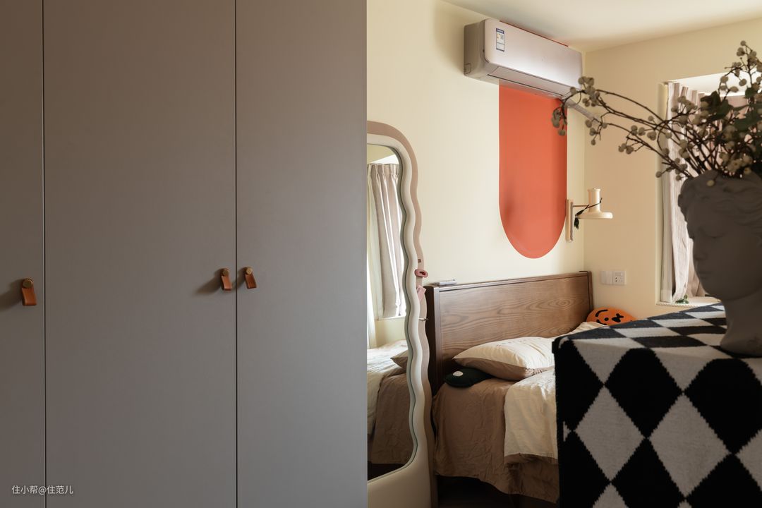 推门而入,顶天立地定制衣柜占了主卧大半面积,灰色柜体和人字拼木地板,又有种日系原木风的质感。 完全步入屋内,更浓郁的复古情调,和色彩的碰撞。 我第一眼注意到的是,空调下方的橙色色块,要说具体的功能性的作用并没有,但恰好与衣柜上的橙色牛皮手柄相映衬,为整间屋子带来了明快活泼的氛围,朝气蓬勃充满希望。