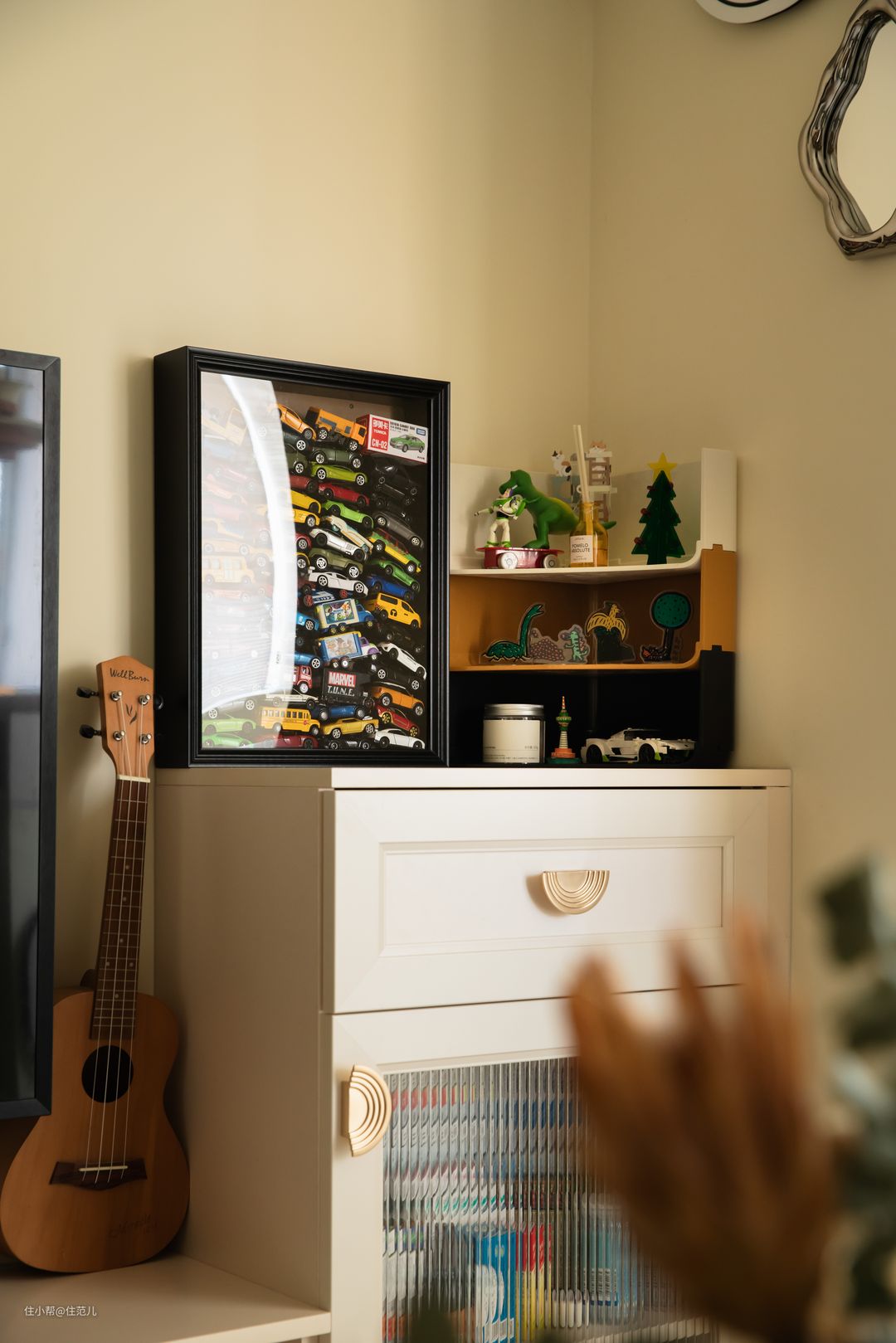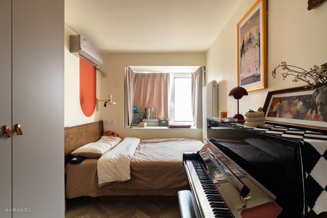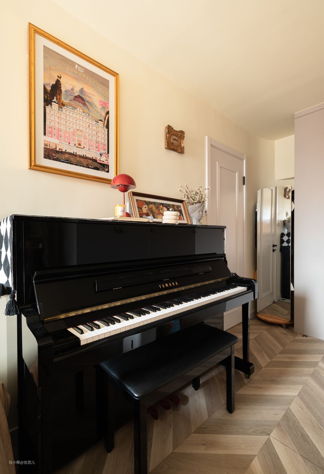 由于将梳妆台移至浴室柜,卧室就拥有了更多可能性,一架钢琴、些许挂画与摆件,令忙碌的生活也颇具艺术情调,于闲暇之余陶冶情操。 屋主的审美品味,体现在家具的选择,体现在小物件的搭配,体现在收纳的规整,体现在墙面、角落处处可见。