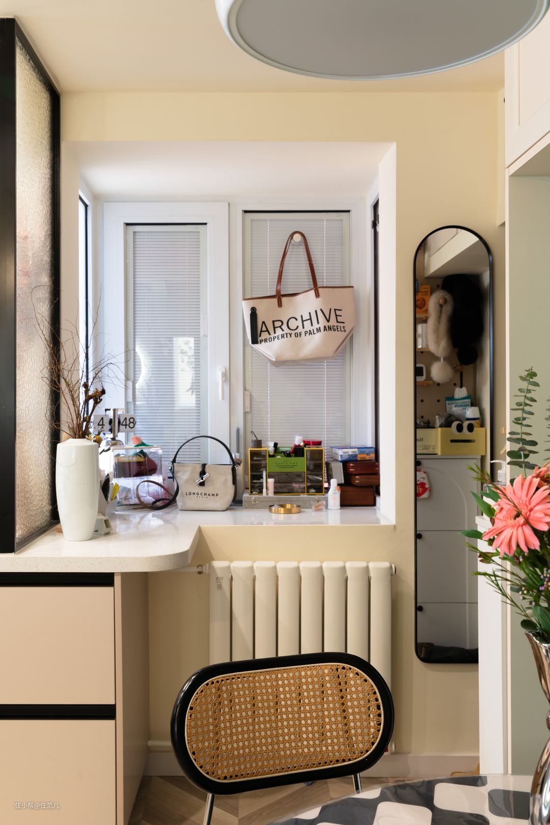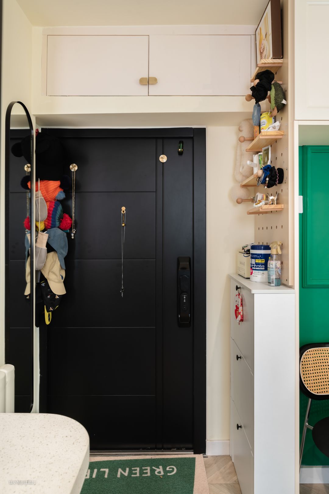 51㎡确实不大的面积,还有小户型的通病——入户即见厨房,在此处设置了一个玻璃隔断,恰好遮住了厨房橱柜储物众多的一角。 屋主于隔断前,自行搭配的白色花瓶、摆件,简单轻盈,是进门后的第一眼视角,不需要多隆重,小空间也十分有意境。 右侧是空间较为充裕的置物平台,随手放置一些出入的杂物,比如包包、首饰、票据、快递盒、、拆快递的剪刀、记号笔之类。 还有一面宽度正合适的上墙镜子,方便出门前整理衣冠,也是屋主后期根据这块尺寸空缺自行选购的。 进门左手边,是一个落地鞋柜,上方洞洞板储物很灵活,挂钩、置物板都可以调节,也恰好挡住了往客厅、卧室去的视野,形成了半封闭式玄关区。 顶部增加了一个储物柜,补充了收纳功能。不过镜子旁边的围巾、帽子,比起玄关,更适合收纳进衣橱内避免落灰。