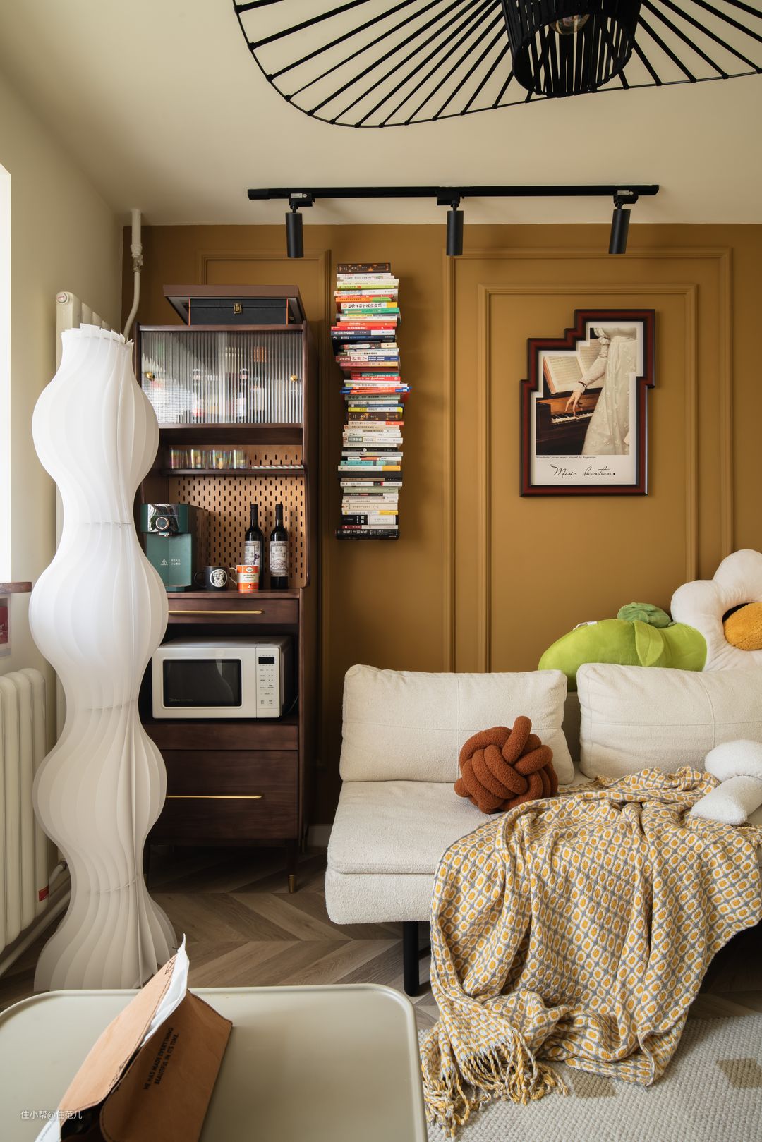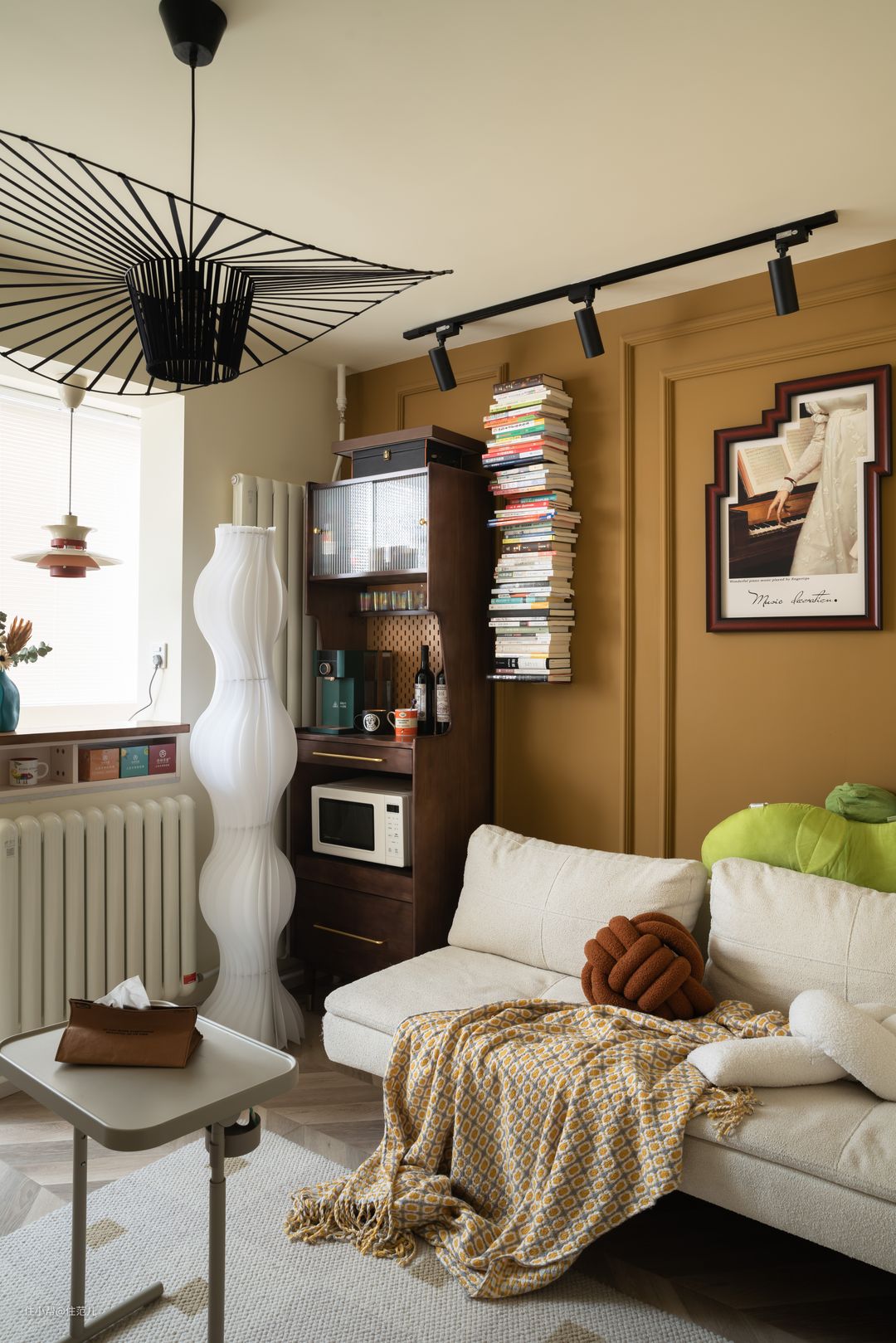客厅是产出美照最多的地方,无论从哪个角度拍,都能美成一种风格,色彩搭配得张扬又和谐。 屋主告诉我们,客厅的沙发墙颜色其实是一盒盲盒漆,是当时出库时候拿错的一罐墙漆,但是当时因为刷完墙之后个人觉得家里还是太“素净”了一些,于是大胆决定刷了它。 没想到最后效果最好的也是这面墙。像极了那句“很多事情回头看,最美的不是如愿以偿,而是阴差阳错。” 一面深色的墙,并没有让小空间显得压抑,反而令原本奶油白的一片增添了沉稳气息,阳台的光线照进来,明亮美好。