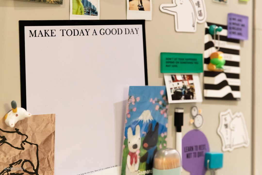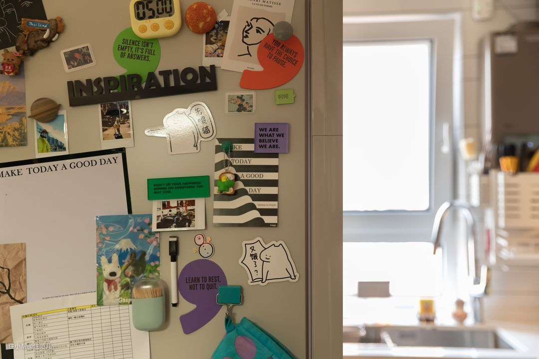 屋主非常擅长使用收纳工具,在玄关和厨房两处收纳重灾区都得以体现,巧妙的挂钩、置物架,即使杂物繁多,也依然有序且有趣。 冰箱侧面贴满的小物件,像是旅行途中购买的冰箱贴、明信片、拍摄的旅行照等等,都是沿途的美好印记。 其中一份清单,列举着一周的待办事项,包括屋内大扫除、陪孩子看展之类的活动,充满了屋主对生活的热忱。