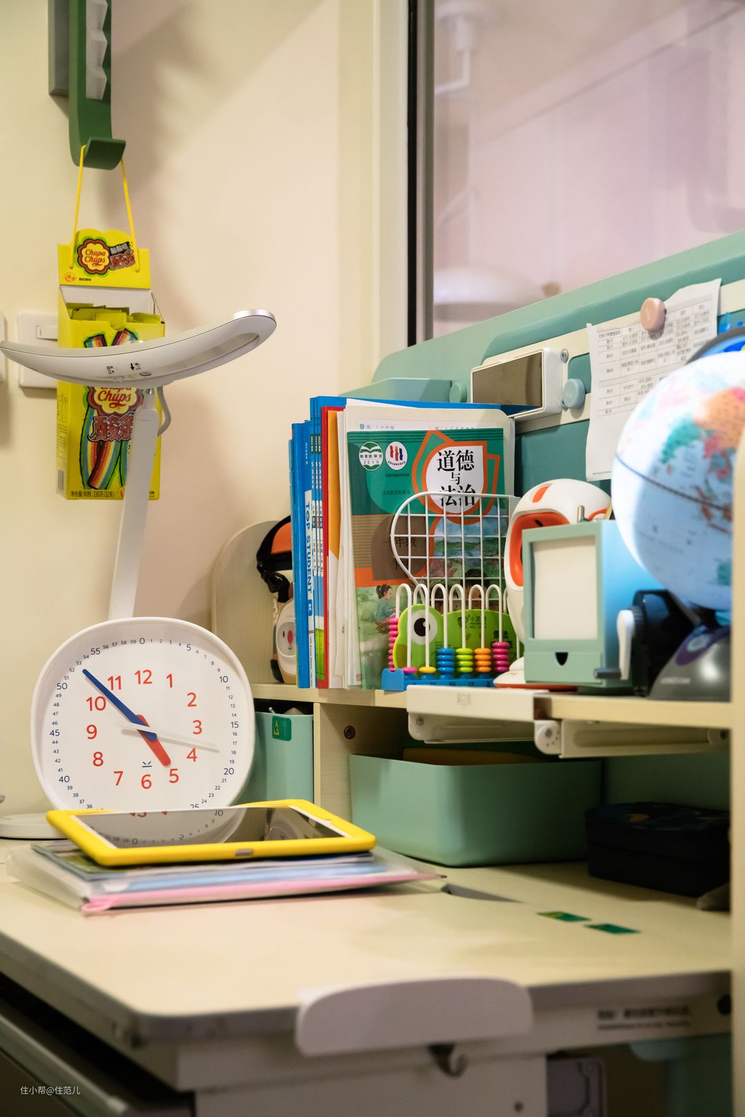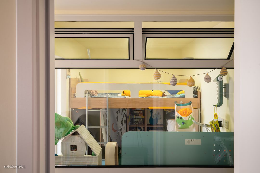 由于孩子大部分时间都在学校、户外或者客厅玩耍,这间小屋主要的功能就是睡眠、学习以及储物。 书桌前方一面窗户,便于通风透气,更显空间敞亮,不至于压抑,也方便亲子之间凭窗交流。