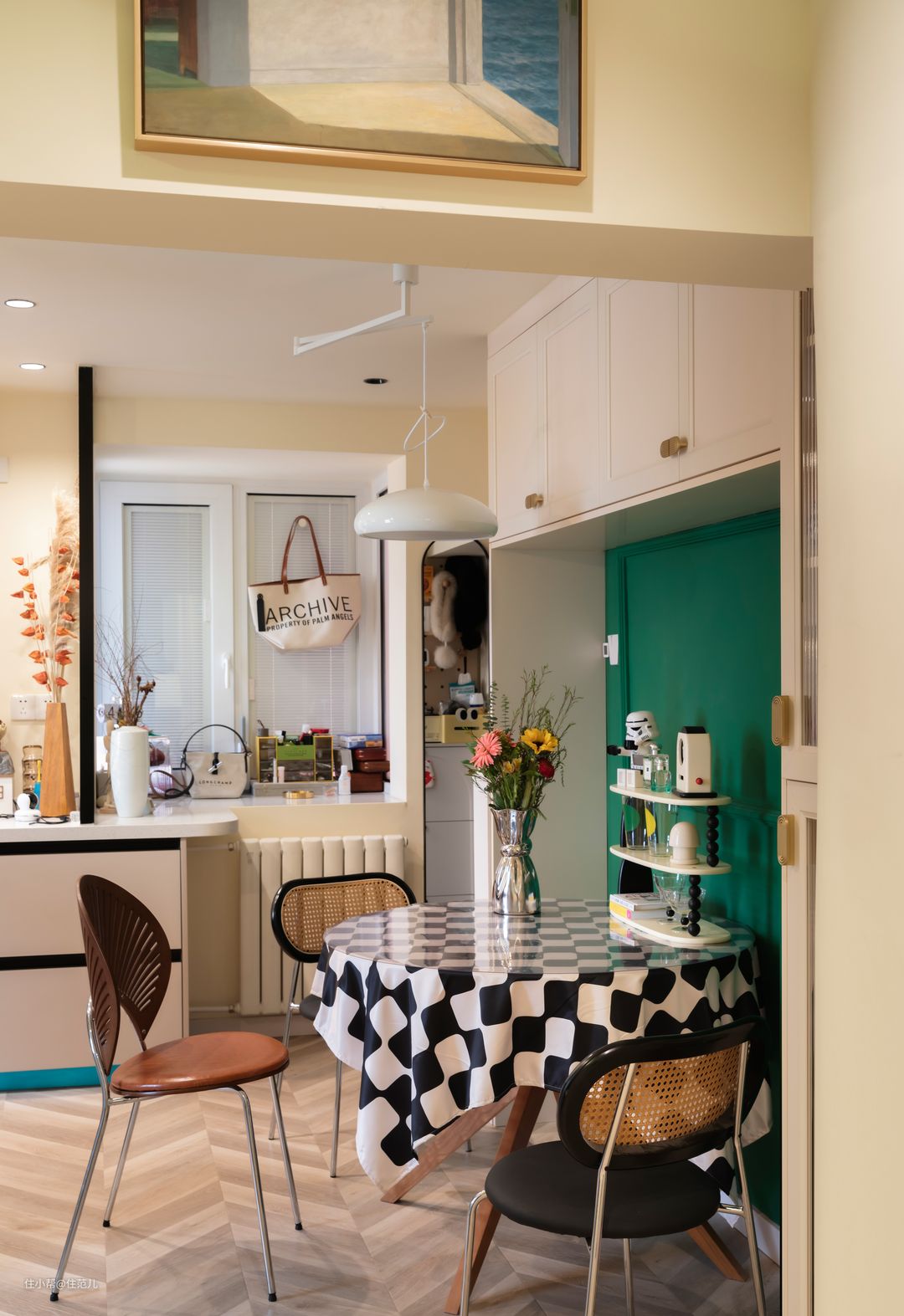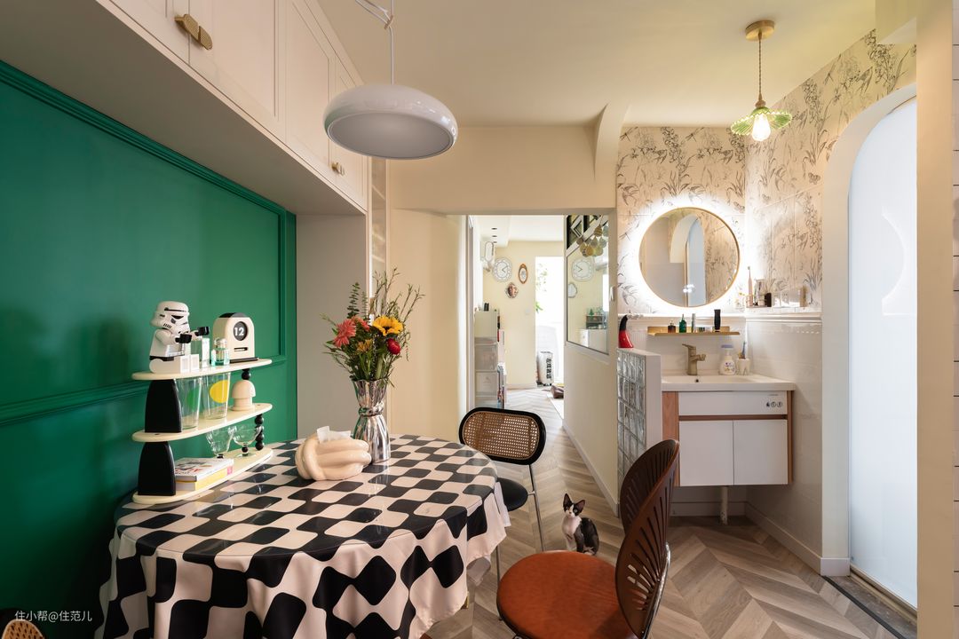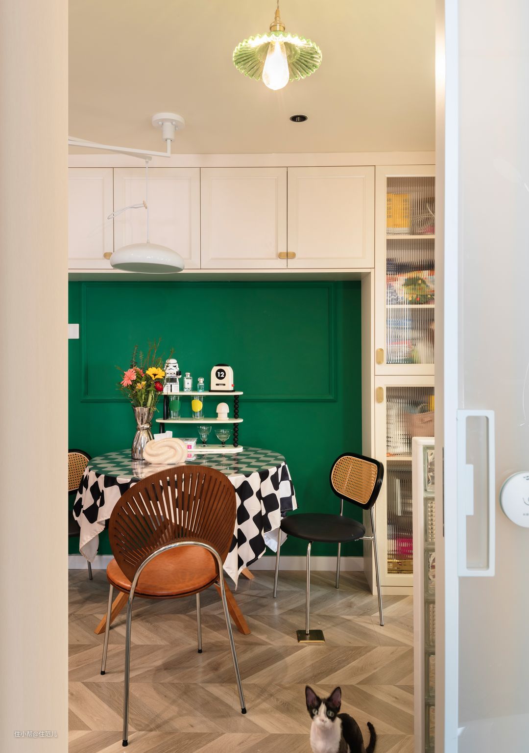 对于小户型而言,所谓餐厅,其实就是一张餐桌。放置在此处,形成一个独立的用餐区,一是为了临近厨房,无论用餐、洗碗都能形成便捷的动线。 二是客厅取缔了餐桌或茶几的设定,给予孩子更宽敞、可以自由活动的空间。 餐厅墨绿的背景墙,用色非常之大胆,屋主介绍说绿墙当时在刷的时候,正巧赶上美缝剂师傅来做工,说了一句,你家台球桌还挺好看。。。 虽然很多朋友给过建议,在“全包”业务中墙面选用更保险的颜色,但是屋主非常坚持墙面需要色彩,会给映入眼帘的第一瞬奠定美好的心情和印象。 最后出来的成果也非常惊艳,关于色彩的选择,屋主也分享了她的小tips:前期需要大量预览“别人家”的成品图,建议不要看效果图,可以多看看用户自己家的实拍,和家里其他家具、饰品的搭配,整体风格还是要一致的。