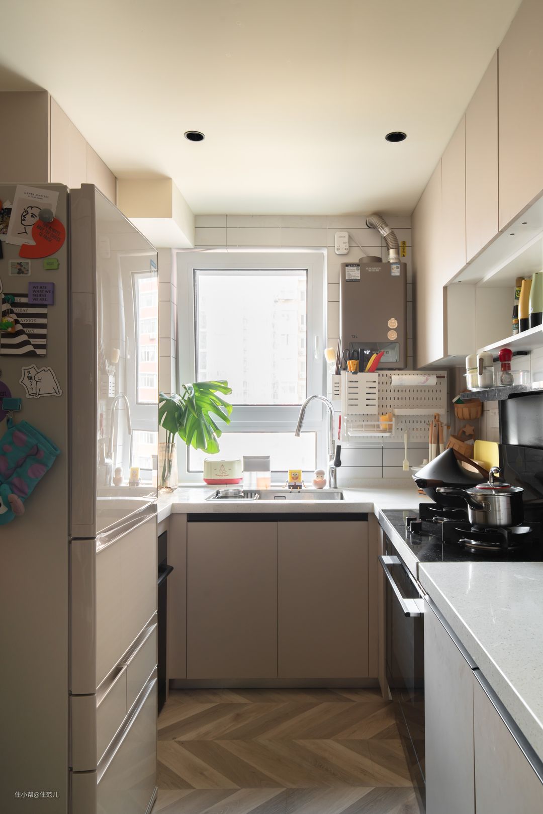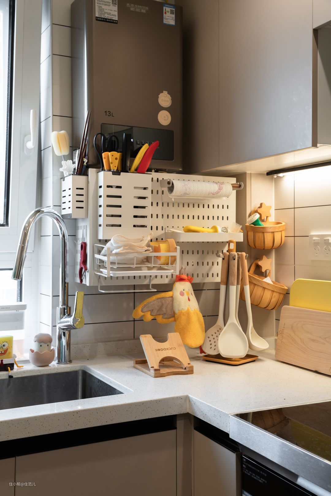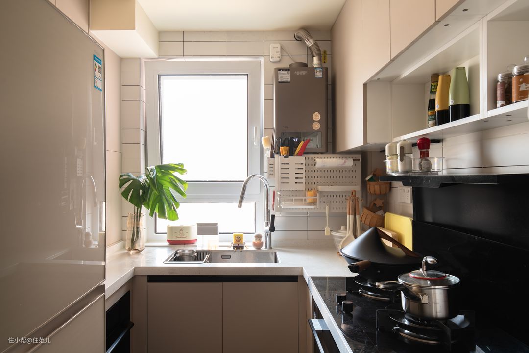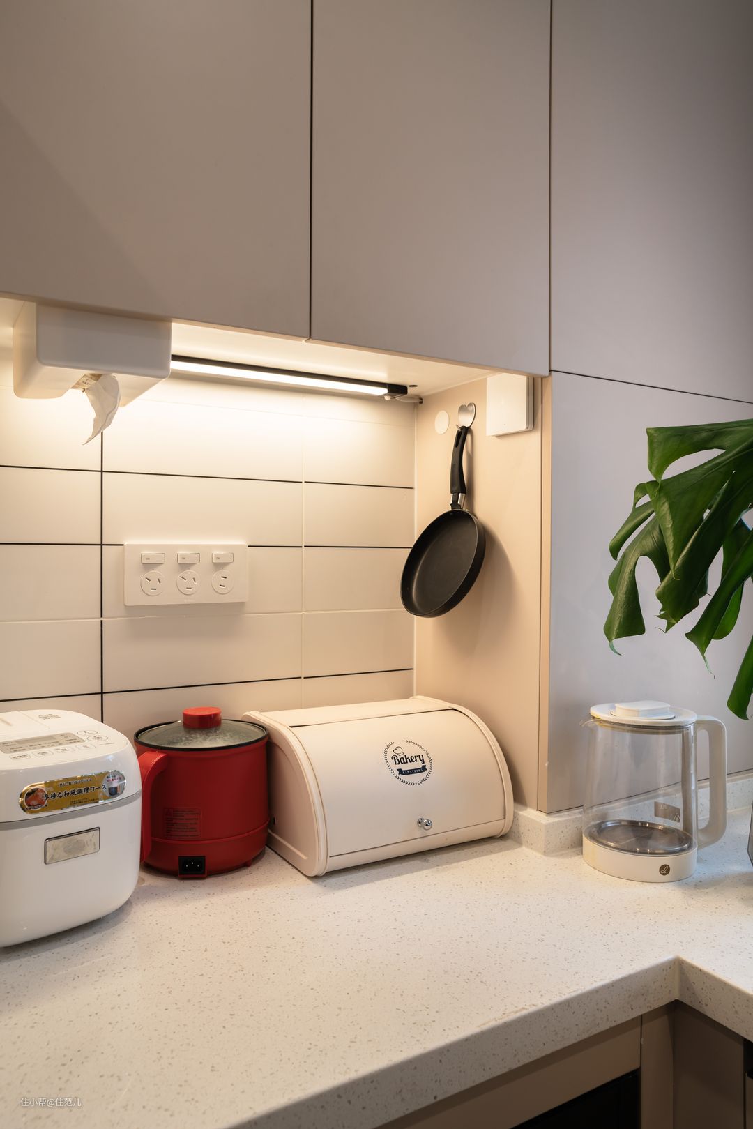 走出玄关,直面一处开放式的小厨房,厨房做成了U型设计,冰箱、水槽、烟灶各占一面,顺从着“拿—洗—切—炒”的动线。 小户型开放式怕的就是油烟,如何选择烟灶以及合适尺寸的冰箱,屋主并没有太多经验和时间去类比挑选,为了省时省力便找了住范儿的家电选配师进行全屋搭配,1v1服务相当于你一个懂家电的朋友。 最终敲定了大吸力的火星人集成灶,和“皮薄馅大”的东芝冰箱,入住半年多,日常下厨索性没有受到油烟的困扰,冰箱小巧精致,内部的存储空间还有余。