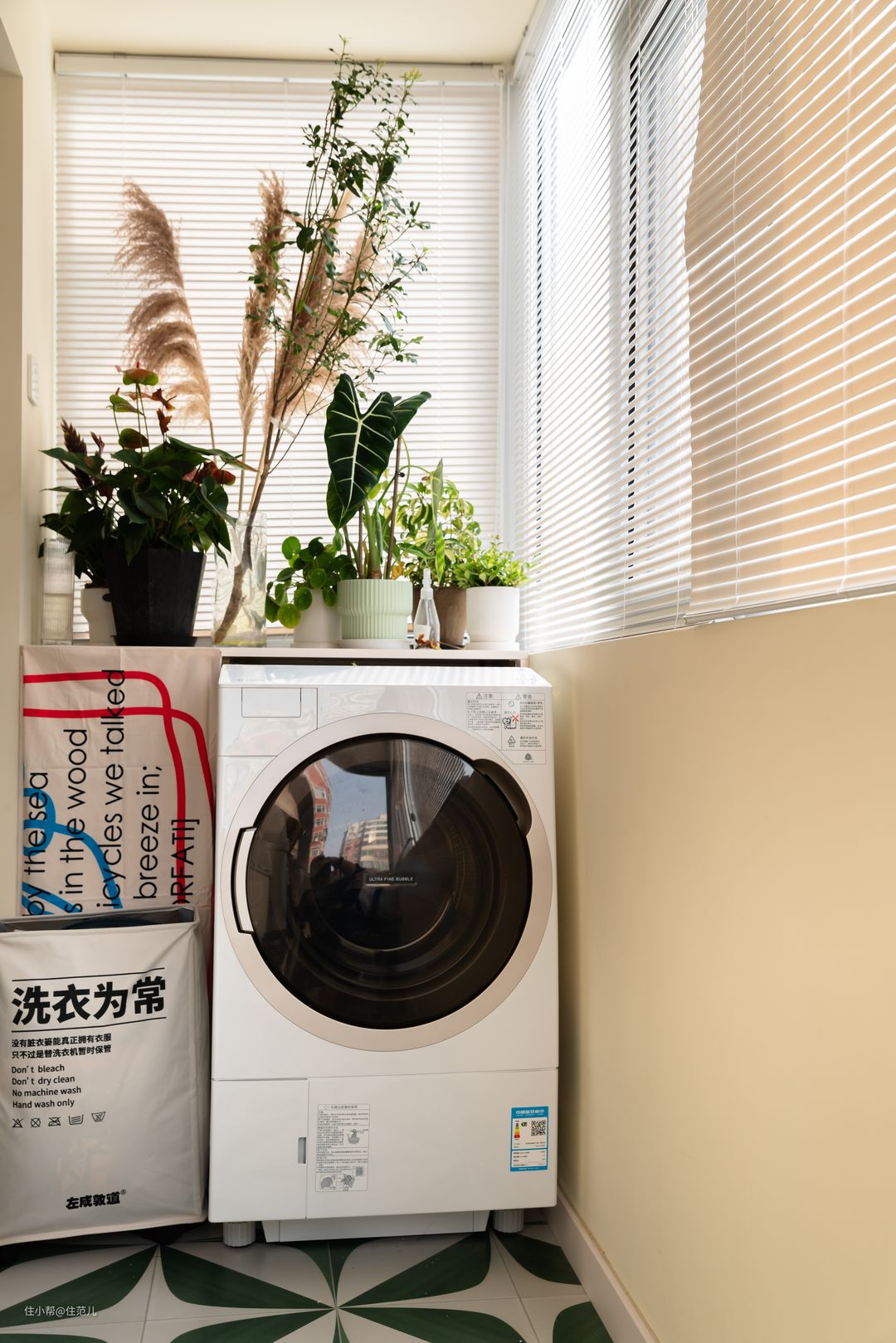 拥有一个光照良好的大阳台,一侧是洗衣区,一台东芝X10热泵式洗烘一体,洗涤和烘干一起解决,没有晾晒衣物的阻拦,阳光能够直接照亮客厅。 另一侧放置了孩子的自行车,为客人来访准备的椅子(屋主是个社牛),以及猫窝、猫砂、猫咪用品柜,打造一个猫猫的专属空间。