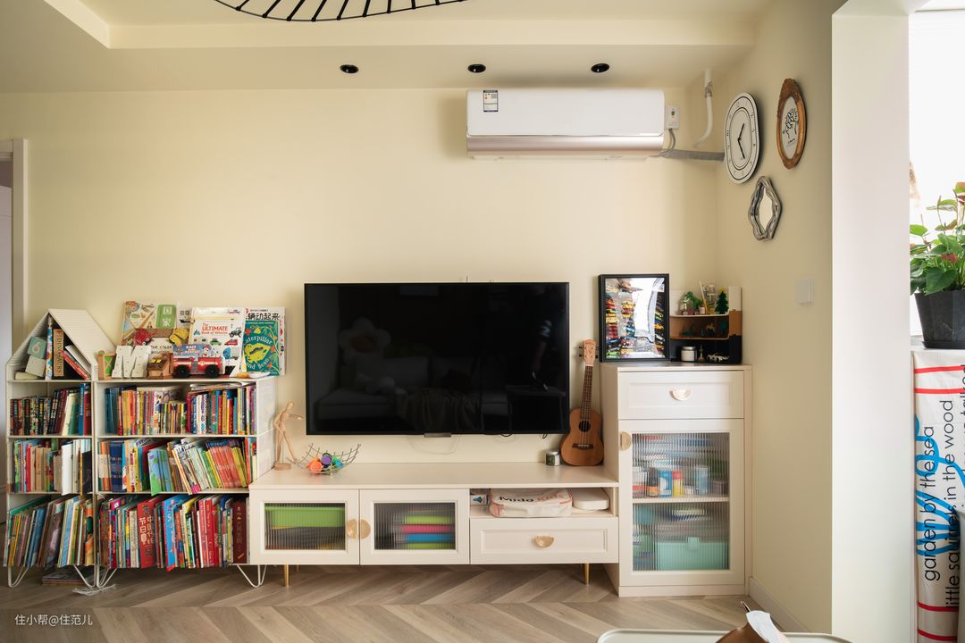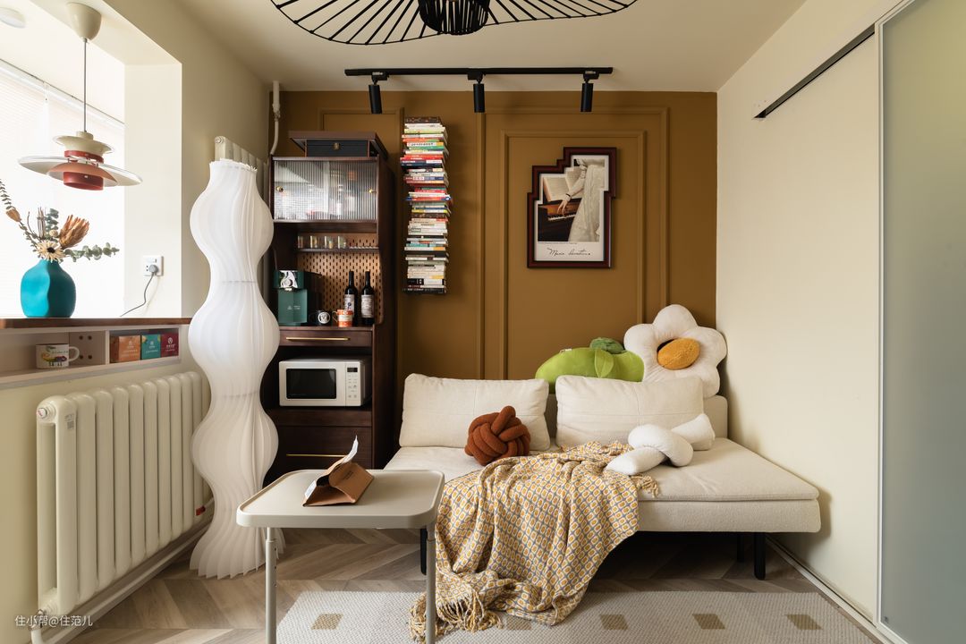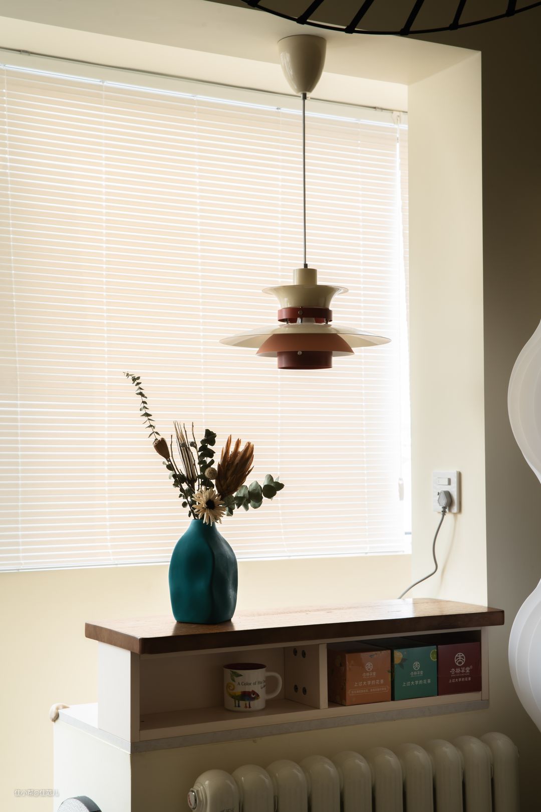关于客厅的储物,电视柜旁的家具都比较低矮,一是为了方便孩子拿取,二是视觉上更宽敞开放。 沙发后的餐边柜是高挑纤细的,是屋主平日里冲泡咖啡、调制酒饮的地方。 侧边的书架,其实是三段式的置物板,屋主在沙发上阅读过的书籍,随手放置在这里,形成了一个奇妙的悬空书架。 阳台的墙垛,也被打造成了很顺手的置物格。书页形的落地灯,不规则几何面的花瓶,与穿过丝丝光线的百叶帘,形成无比惬意的午后光景。