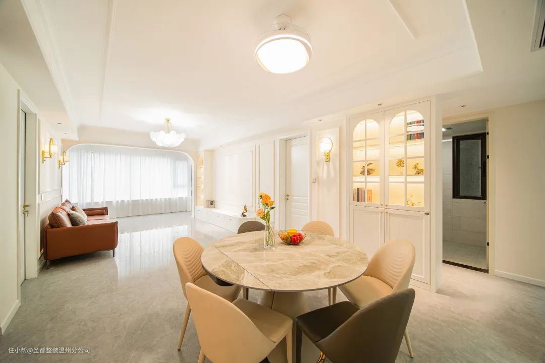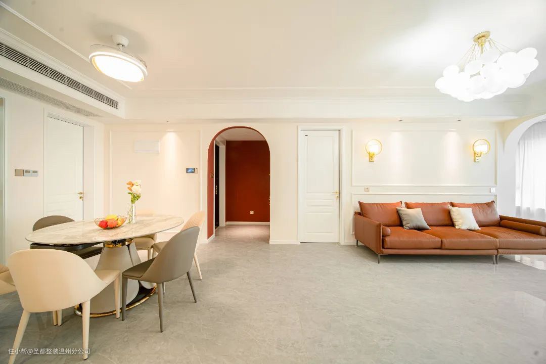 大理石纹理餐桌+双色皮质座椅,让空间内容更加丰富,也增加了温润自然质感。墙面的嵌入式拱形壁龛与拱形门相呼应,让墙面更加完整并且不浪费空间。 客餐厅一体化设计不仅提高了空间设计的利用效率,还提高了整个空间的设计感和透光度,为空间营造通透的呼吸感和精致度。
